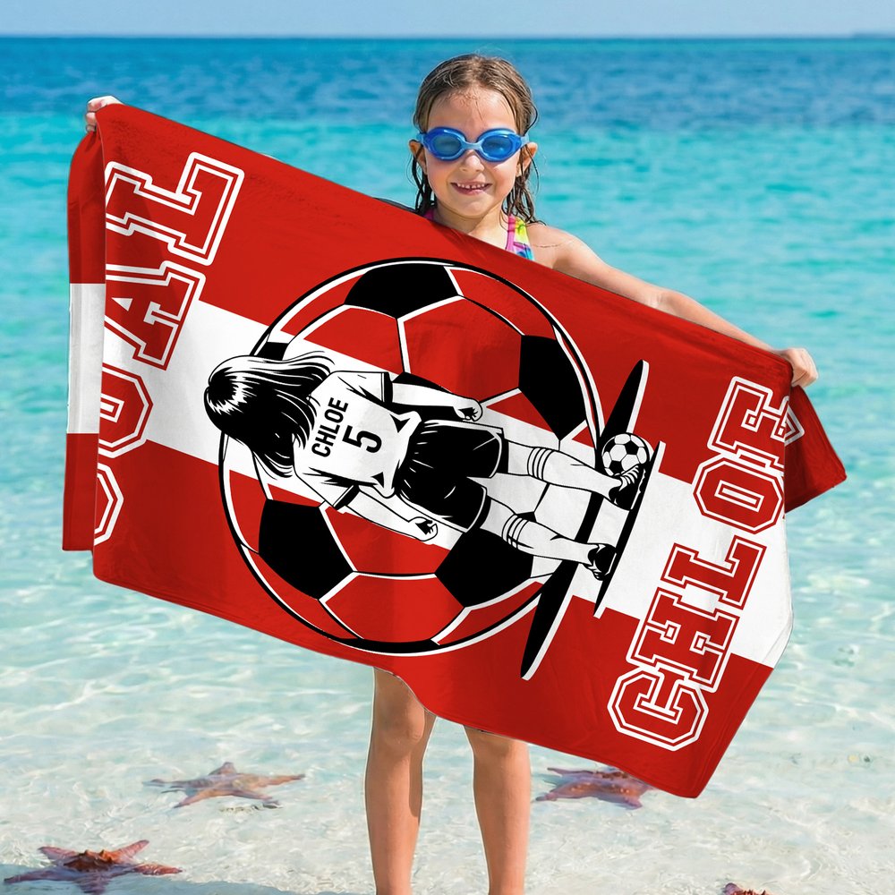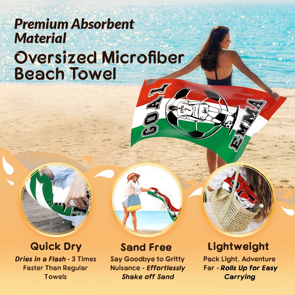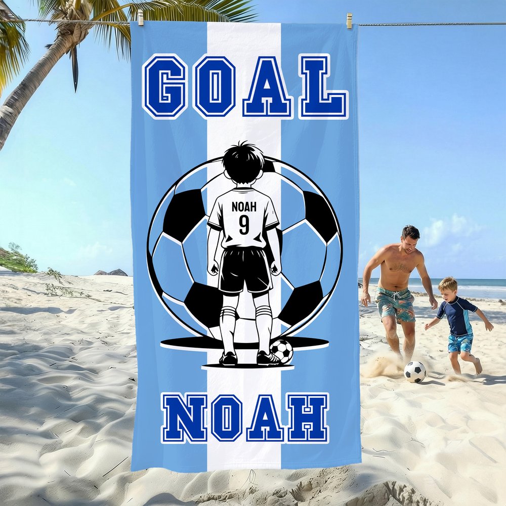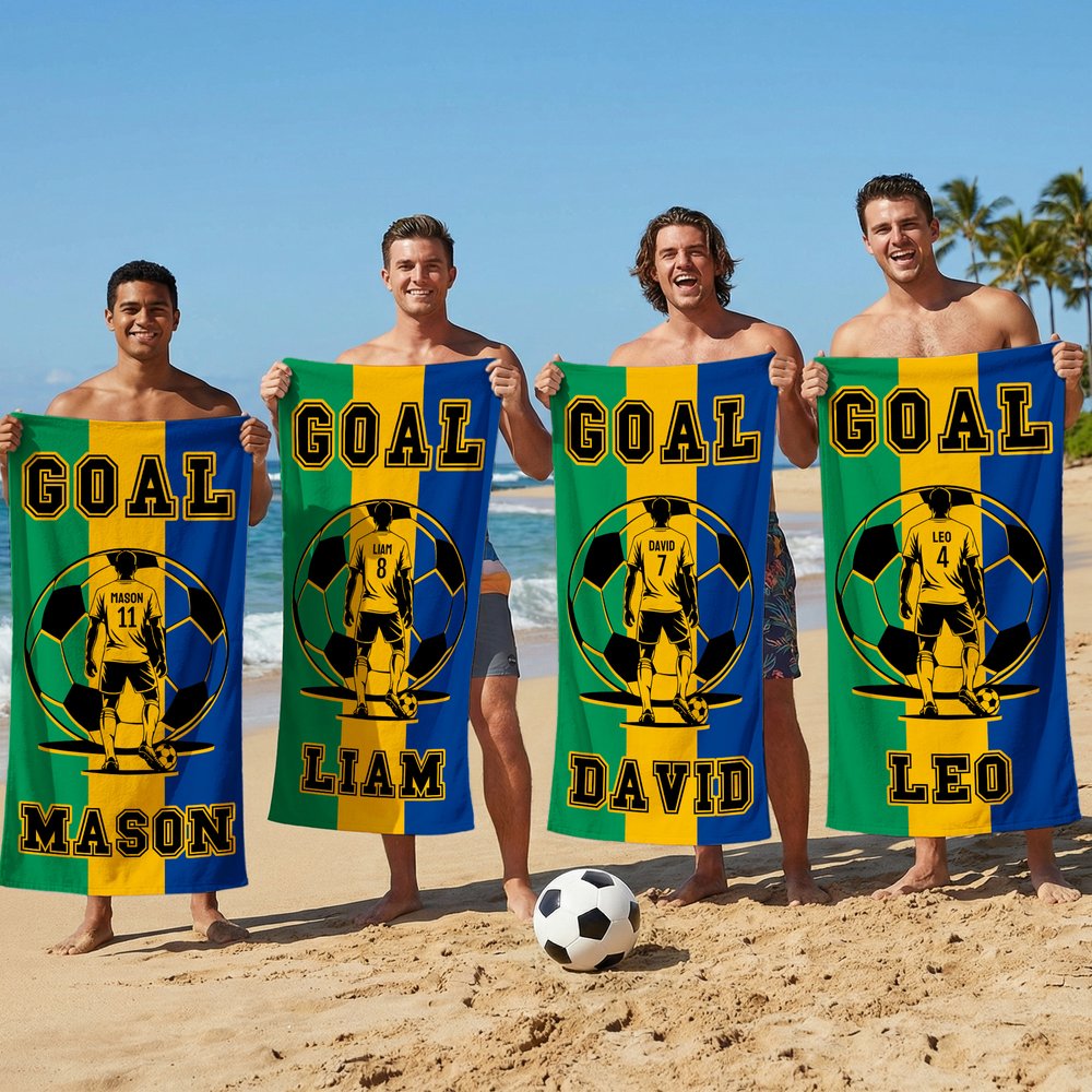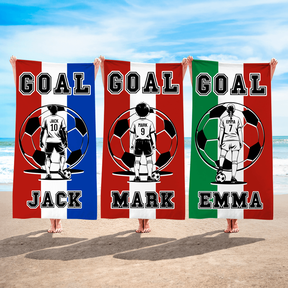 Questo telo da spiaggia vanta un design a tema calcistico di grande impatto visivo! Il suo caratteristico motivo a strisce verticali a tre colori offre un look altamente riconoscibile e dinamico. La silhouette del calciatore al centro cattura perfettamente l'atmosfera iconica di una maglia da gioco. Abbinato al titolo "GOAL" in alto, oltre al nome e al numero personalizzati, unisce senza sforzo la personalizzazione alla pura passione calcistica.
