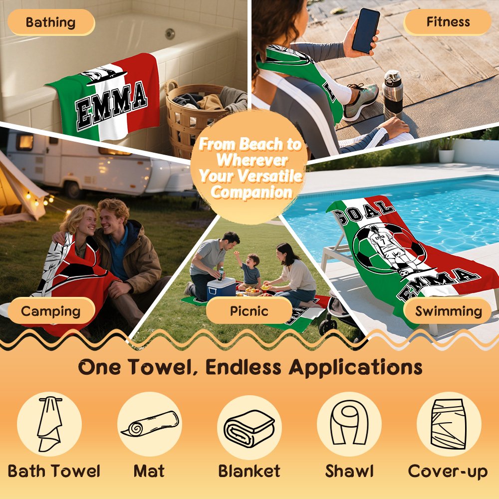 Perfetto per le vacanze in spiaggia e le feste in piscina, questo asciugamano assorbe rapidamente l'umidità, mantiene asciutti e protegge dal sole, per non sentirsi mai umidi o appiccicosi. È perfetto anche per rilassarsi in piscina, in campeggio, nei picnic e dopo l'allenamento. Leggero e pieghevole per una facile trasportabilità, vi permette di mostrare il vostro amore per il calcio ovunque vi porti la vita.