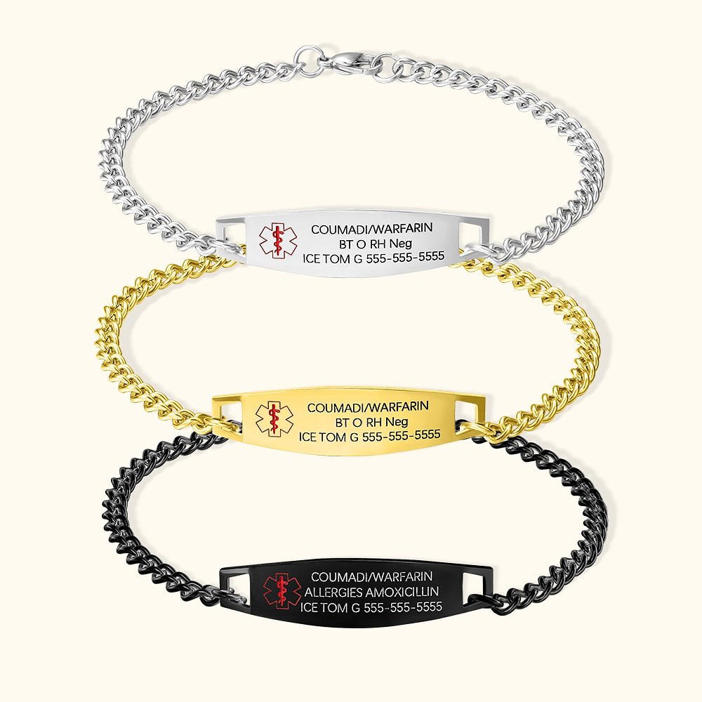 Il braccialetto medico personalizzato, bello ed elegante, è progettato per fornire importanti informazioni mediche in caso di emergenza. È dotato di un'etichetta identificativa in acciaio inossidabile che può essere incisa con importanti dettagli medici come allergie, farmaci e informazioni di contatto per le emergenze.