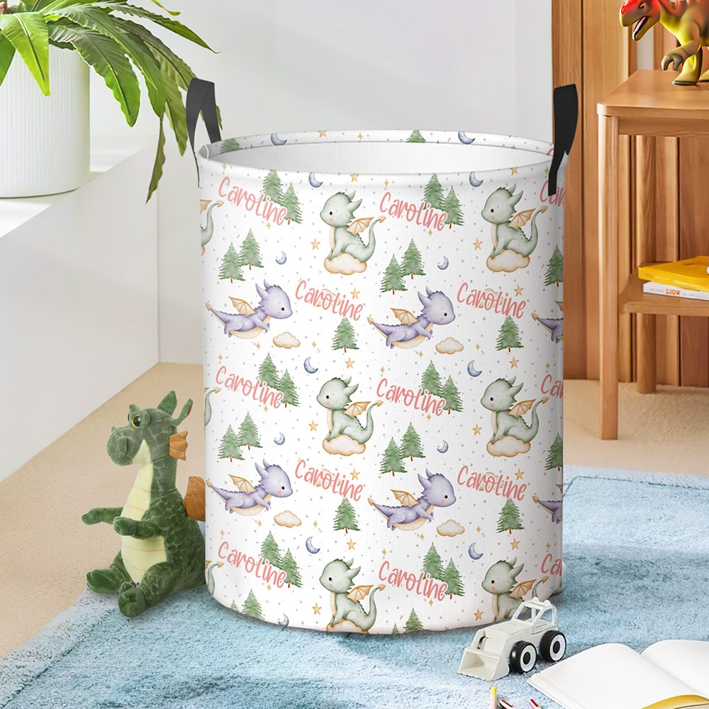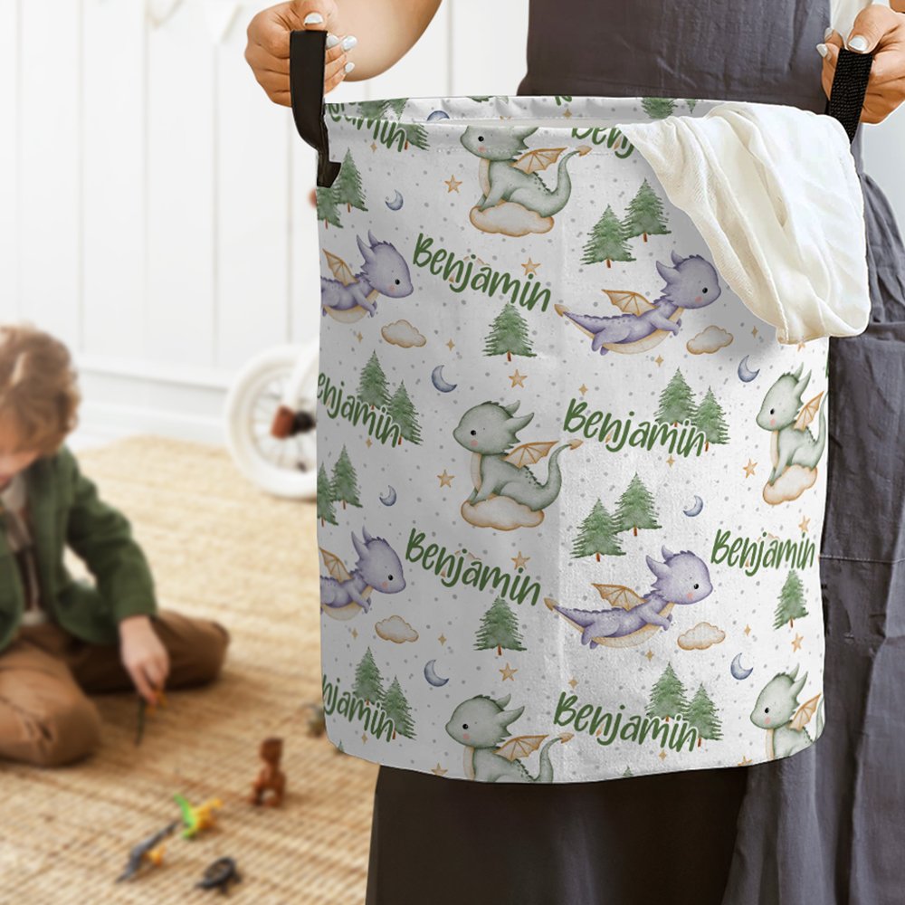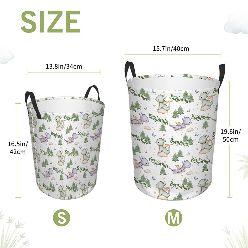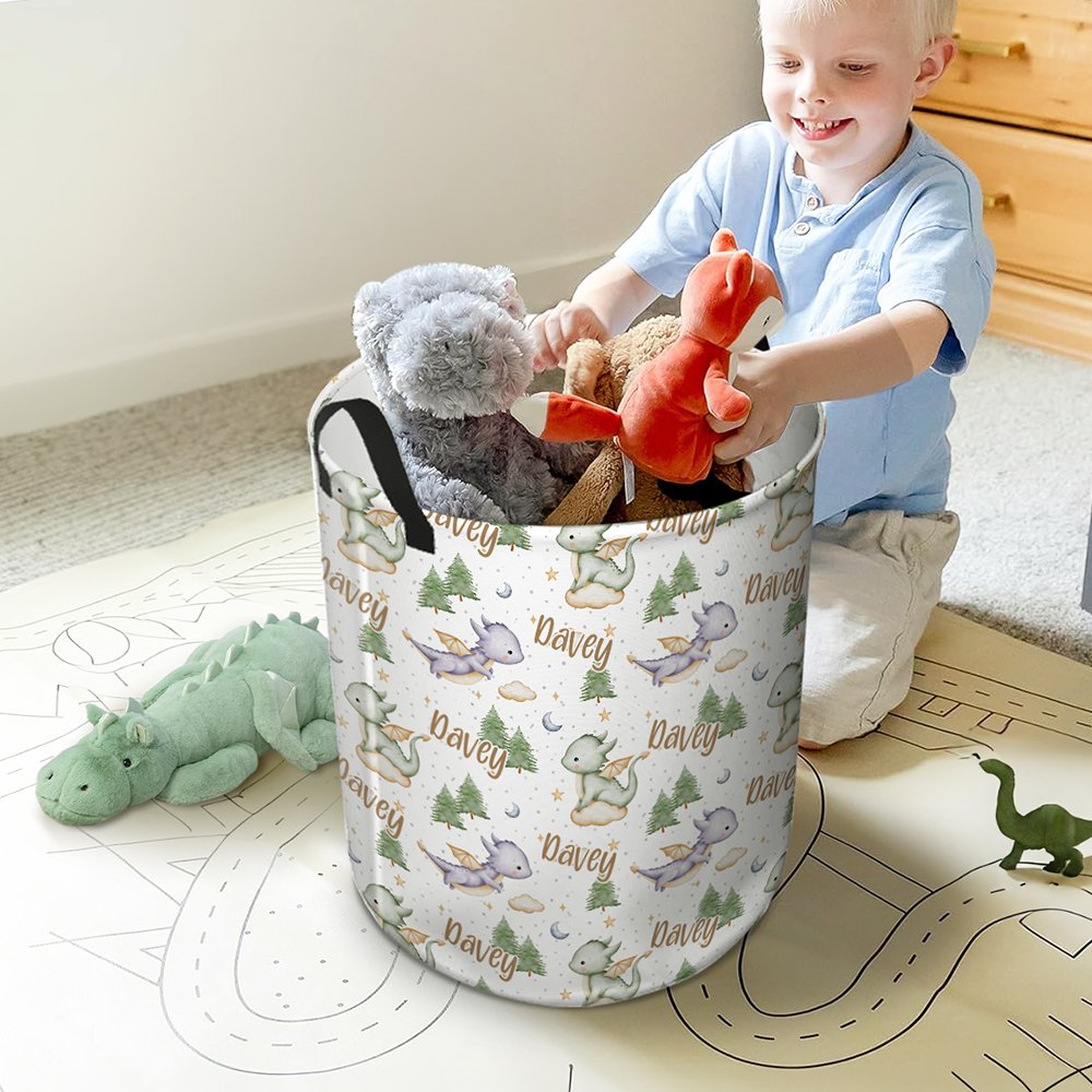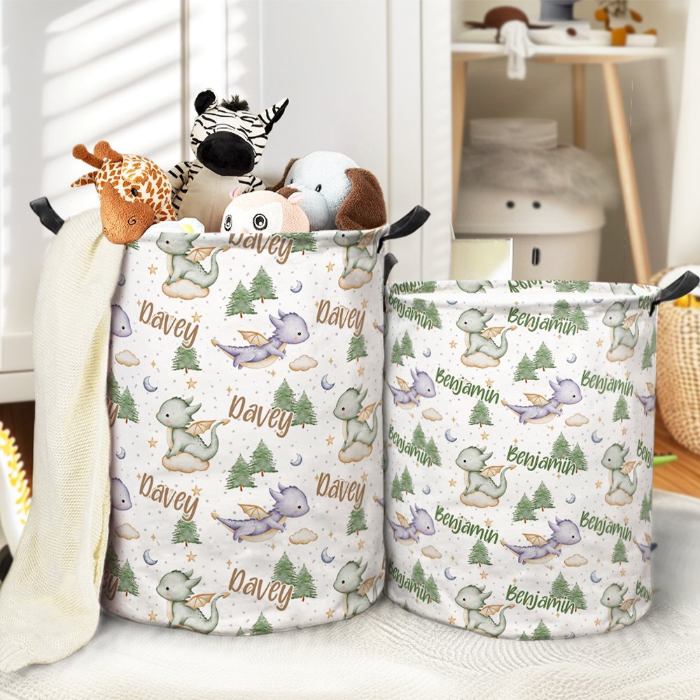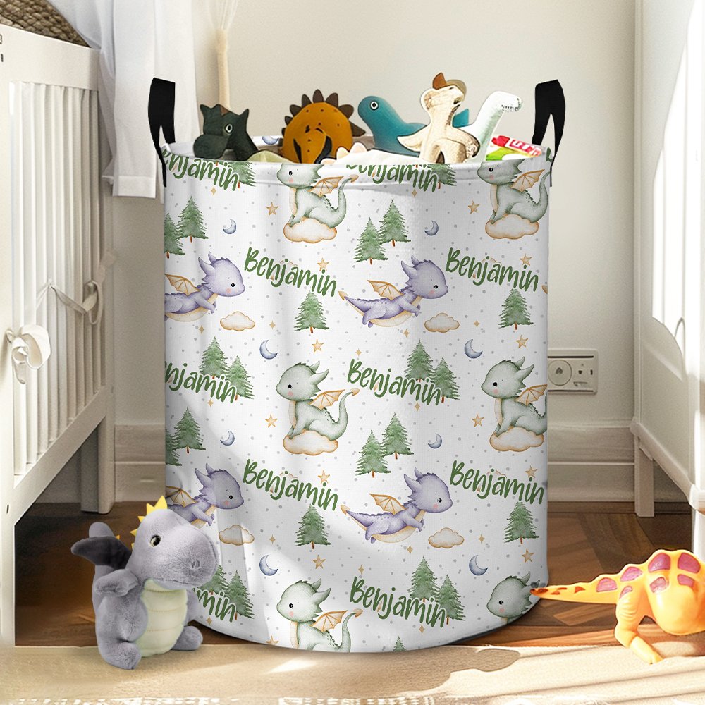 Questo cestino portaoggetti si distingue per il suo simpatico design a forma di dinosauro. Il cestino è stampato con uno sfondo nebuloso da sogno e simpatiche illustrazioni di draghetti volanti, molto fiabesche e amate dai bambini. La cosa più speciale è che è possibile personalizzare il nome esclusivo di questo cestino portaoggetti, rendendolo un articolo davvero personalizzato e mostrando il fascino unico del vostro bambino.
