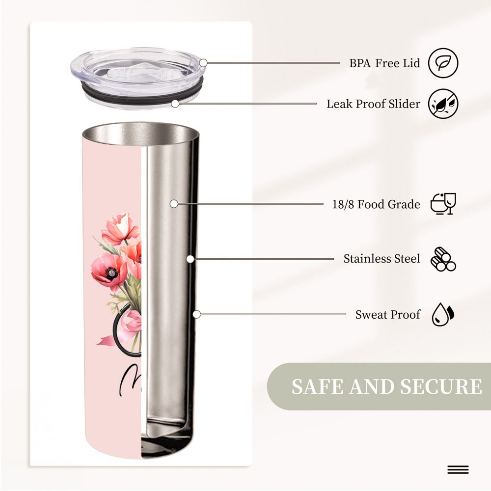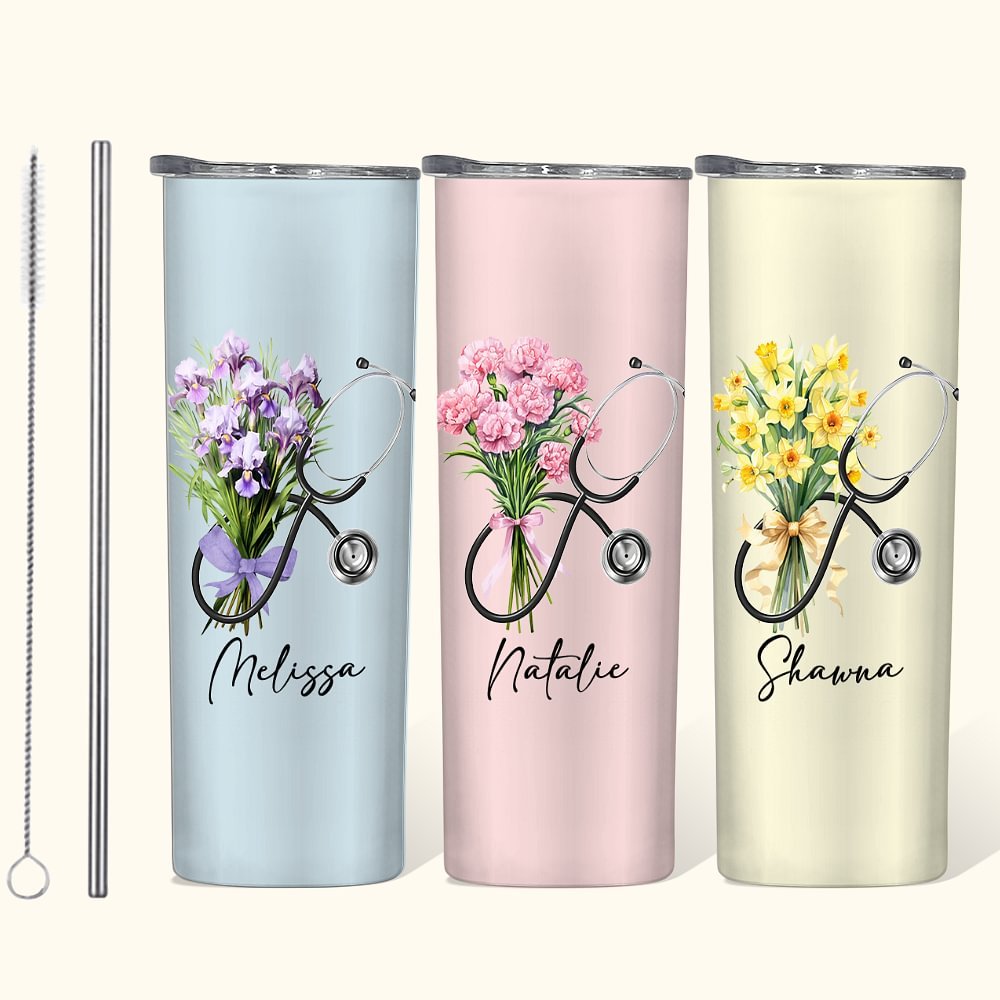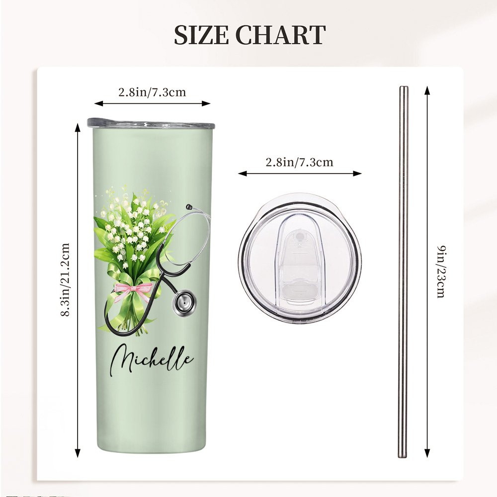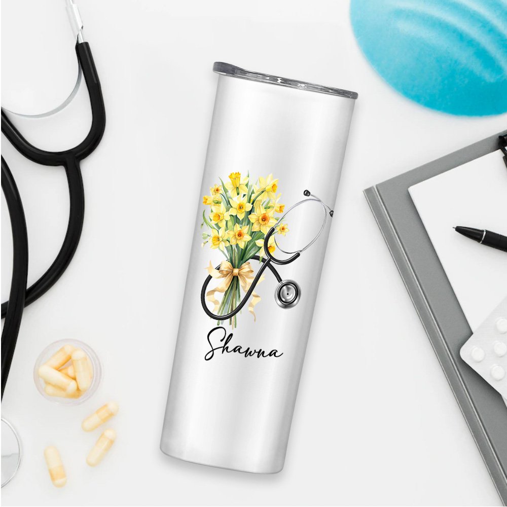 Questo tumbler personalizzato è stato realizzato appositamente per gli operatori sanitari. Il nome del medico può essere personalizzato. L'ingegnosa combinazione di stetoscopi e fiori di nascita è bella e generosa e contiene profondo rispetto e benedizione per la professione medica.