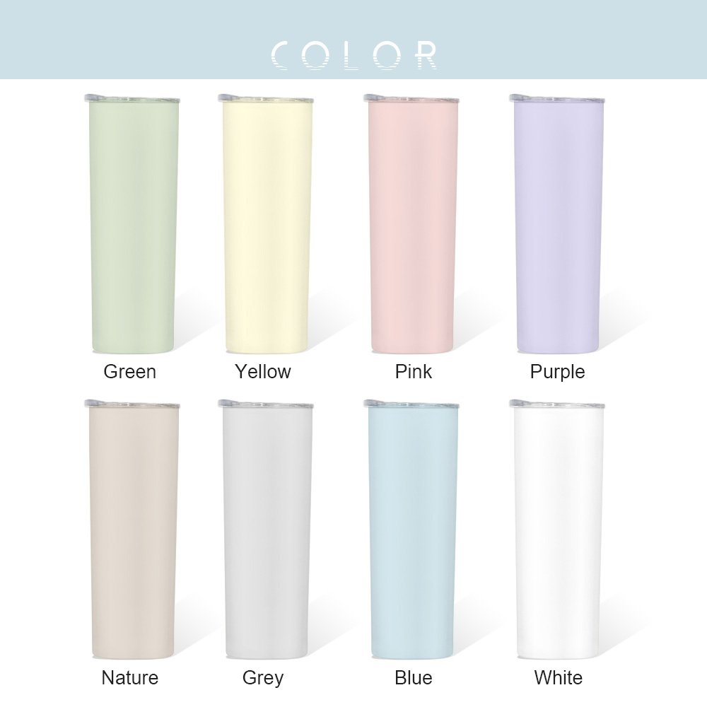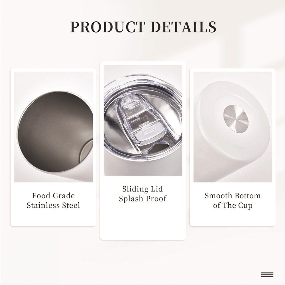 Realizzato in acciaio inossidabile 304 all'interno e 201 all'esterno, questo tumbler sottile da 20 oz è resistente e sicuro per l'uso quotidiano. È dotato di un coperchio senza BPA e di un cursore a prova di perdite. La sua struttura robusta garantisce prestazioni di lunga durata, mantenendo la freschezza e la temperatura delle bevande.