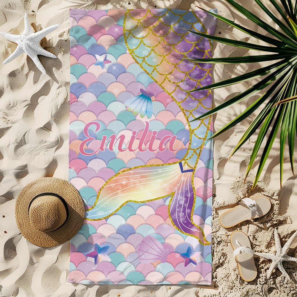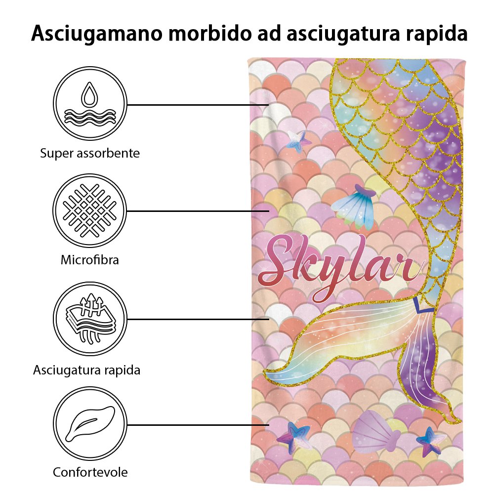 Con squame colorate e code di pesce realistiche, il motivo della sirena aggiunge un tocco di estate e di colore da sogno al telo da mare, e ogni tratto e dettaglio è stato progettato con cura. Le opzioni di personalizzazione consentono di aggiungere il proprio nome all'asciugamano, rendendolo un regalo ancora più unico e speciale.