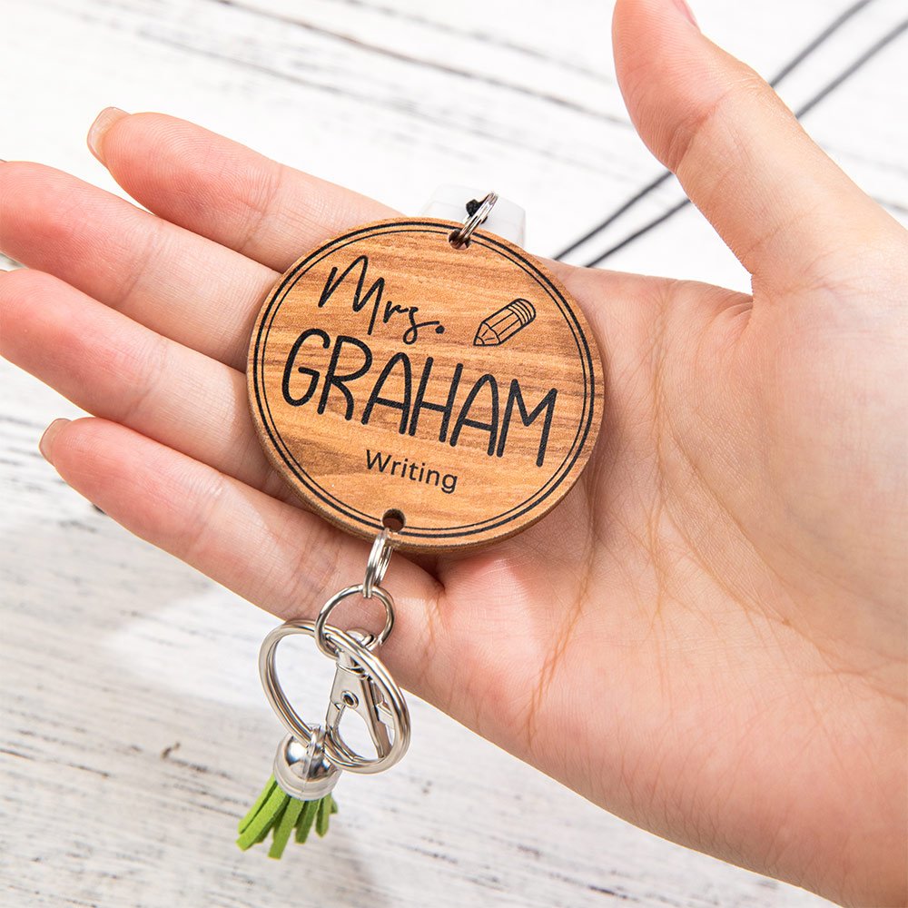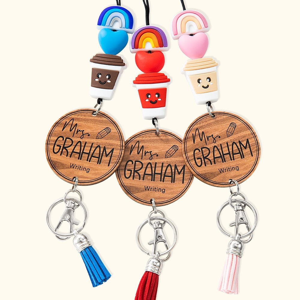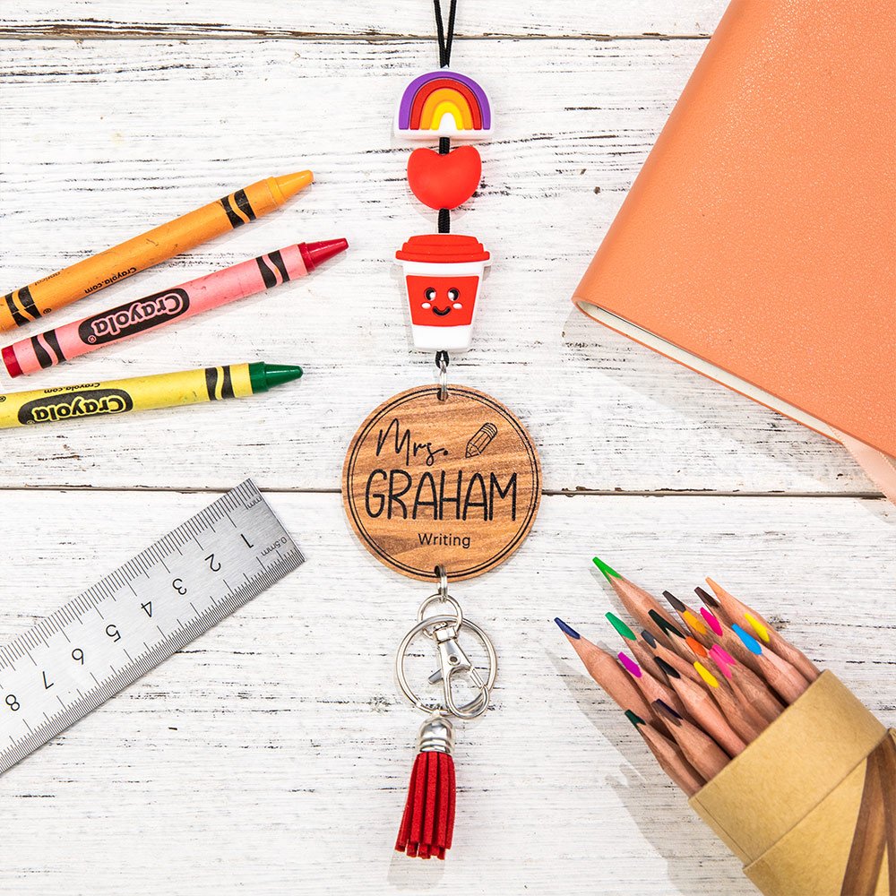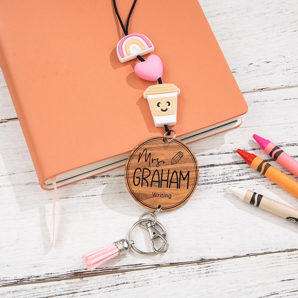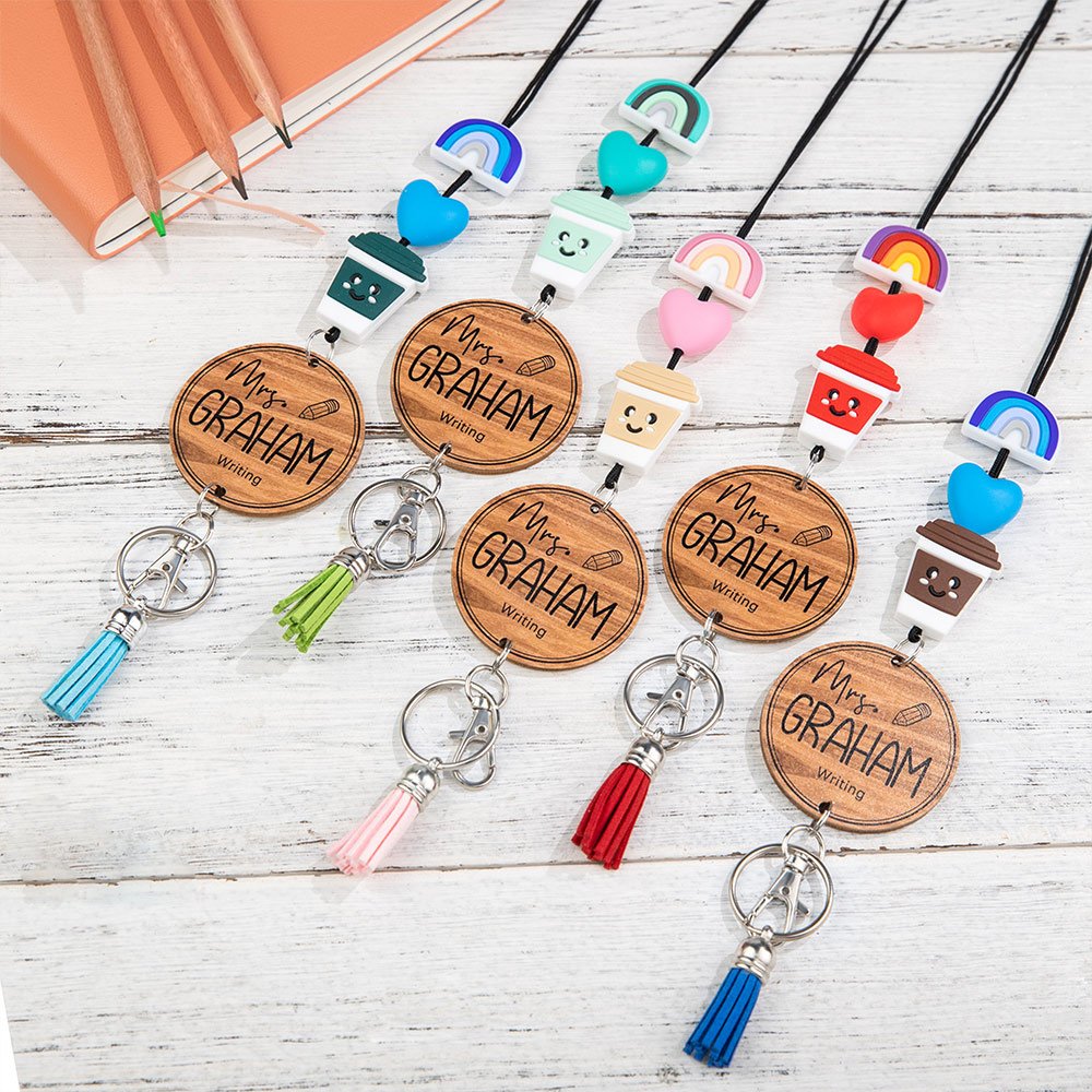 Questo splendido cordino è composto da 3 perline in silicone, un tondo in legno da 2" con incisione personalizzata e una nappina, il tutto appeso a un cordino di raso nero con chiusura di sicurezza a strappo. Il cordino è dotato di una chiusura a moschettone girevole in metallo da 1,5" e di un anello divisorio, in modo da poter appendere facilmente sia il tesserino scolastico che le chiavi della classe, se necessario. È inoltre possibile aggiungere un portadocumenti verticale o orizzontale.