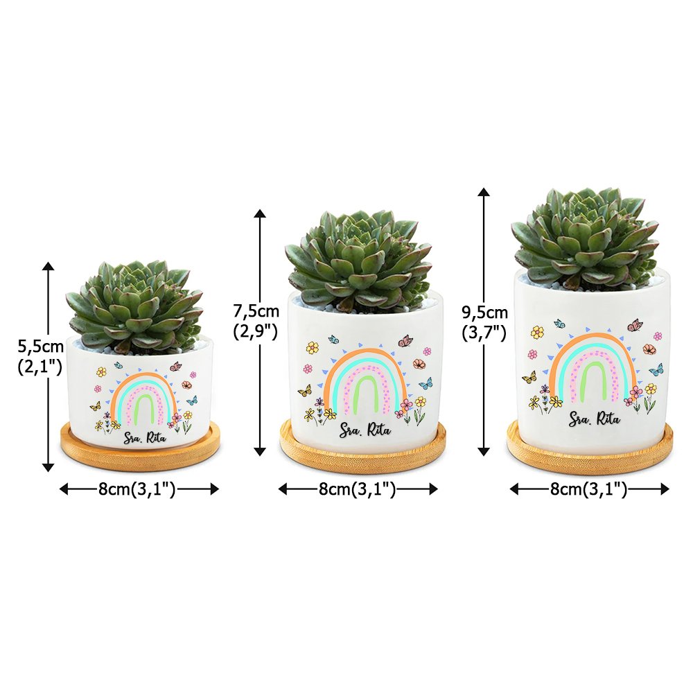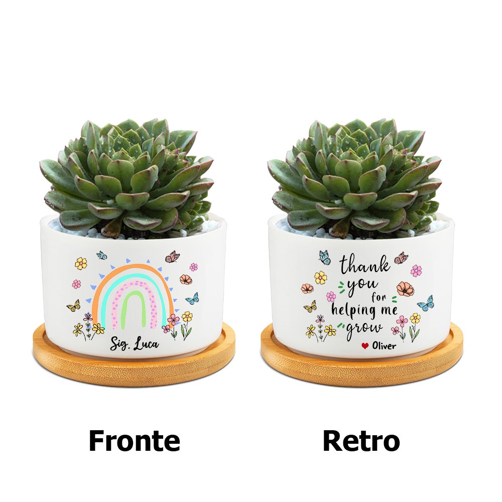 Perfetto per la settimana dell'apprezzamento degli insegnanti o come regalo per il ritorno a scuola, questo vaso in ceramica è decorato con il nome di chi lo dona e dell'insegnante, oltre che con la frase "Grazie per avermi aiutato a crescere", un modo sentito per esprimere gratitudine. I vivaci disegni di arcobaleni, fiori e farfalle aggiungono un tocco di allegria a qualsiasi spazio.
