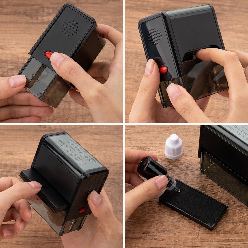 Cura: - Dopo ogni utilizzo, pulire delicatamente la superficie del timbro con un panno umido o un panno privo di lanugine per rimuovere eventuali residui di inchiostro. - Conservare il timbro in un luogo buio e asciutto, lontano dalla luce diretta del sole, per evitare il deterioramento del materiale del timbro.