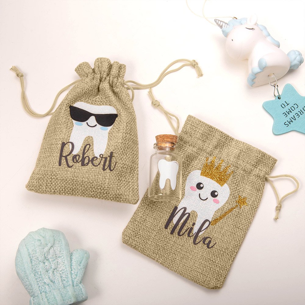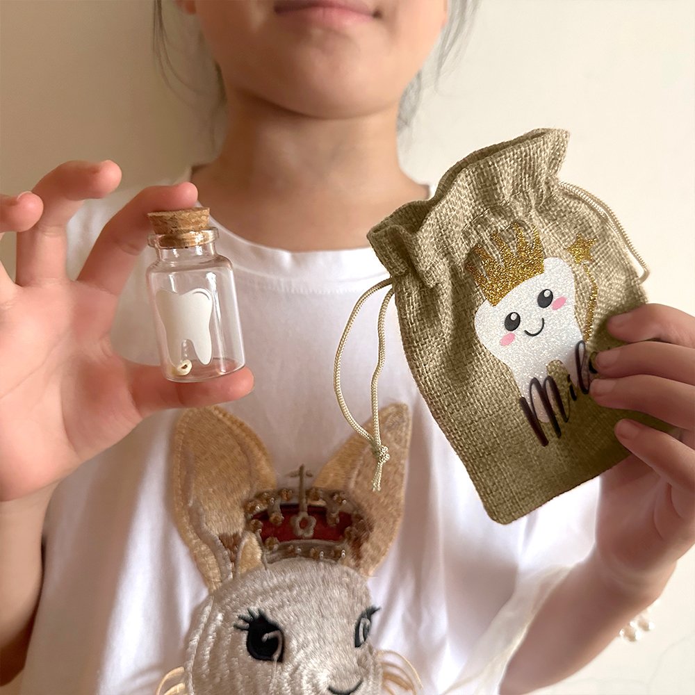 La nostra borsa della fatina dei denti è il regalo perfetto per i bambini entusiasti che non vedono l'ora di perdere i loro denti da latte e visitare la fatina dei denti. È anche un modo favoloso per rendere l'esperienza extra speciale e memorabile per il vostro bambino, rendendo la visita della fatina dei denti un momento caro nei suoi ricordi d'infanzia.