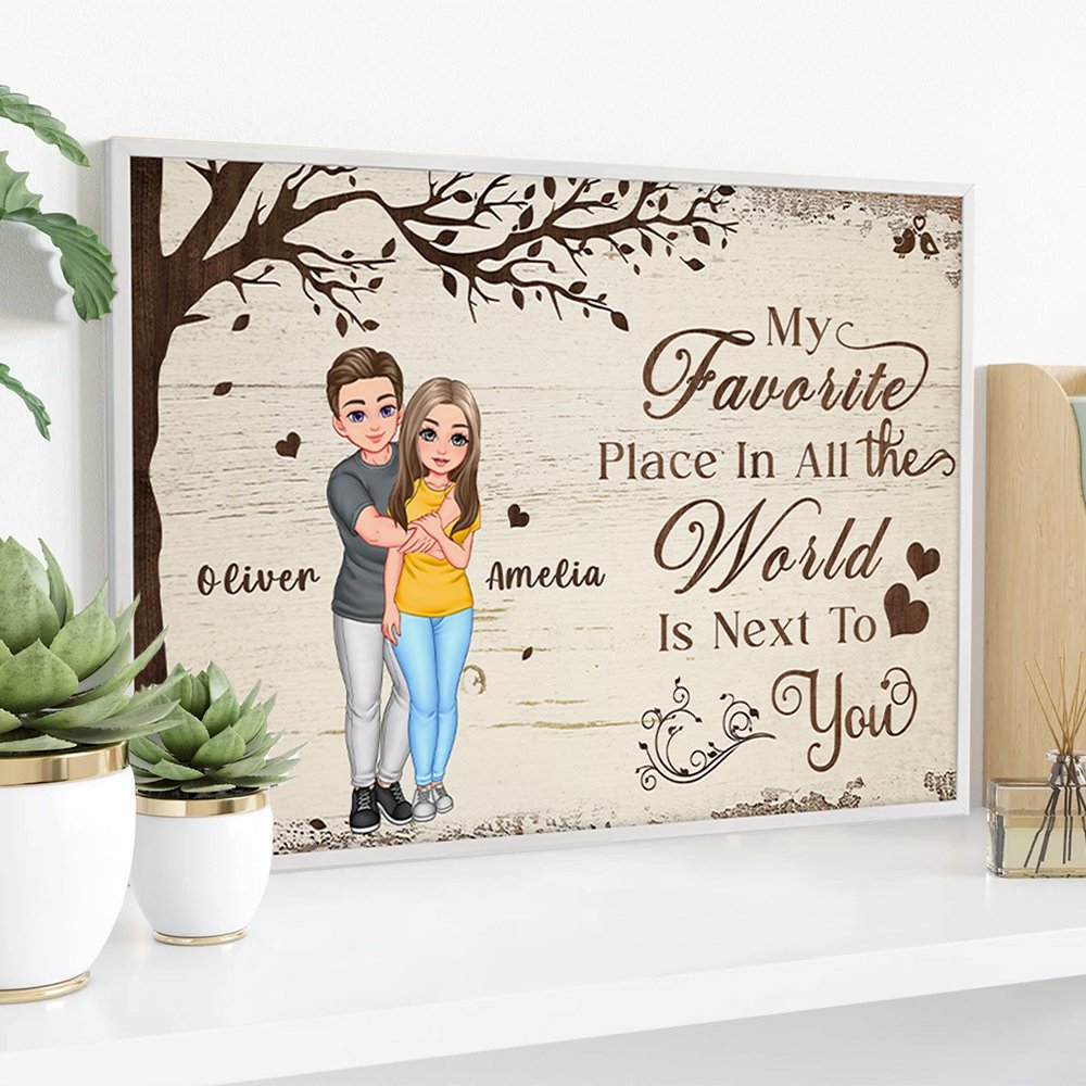 Questo dipinto su tela raffigura un caldo abbraccio di coppia. Nell'immagine, due persone si abbracciano strettamente, in piedi accanto a un grande albero, con lo sfondo colorato dalle venature del legno, che dà alle persone una sensazione di naturalezza e calore. Il nome personalizzato sulla tela e le parole romantiche "My Favorite Place In All the World Is Next To You" aggiungono profondità emotiva, rendendo questo poster non solo un ornamento ma anche un simbolo d'amore.