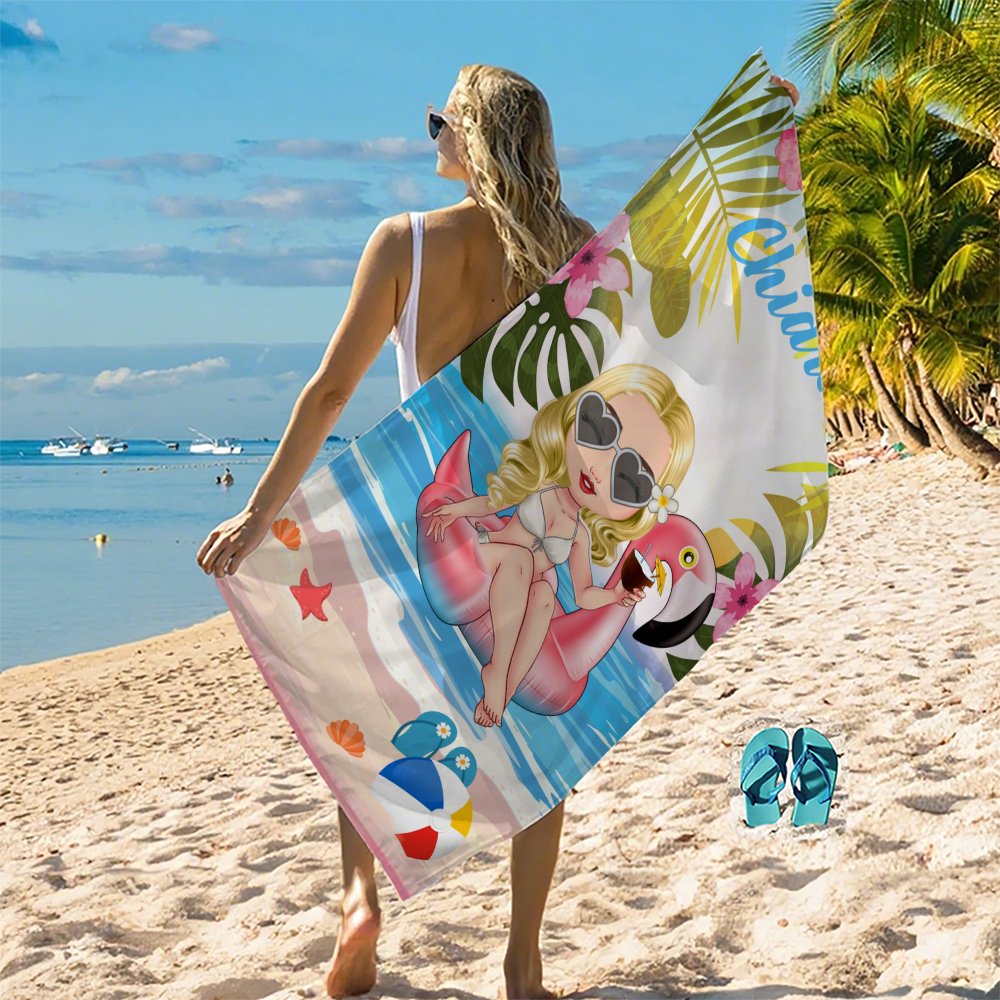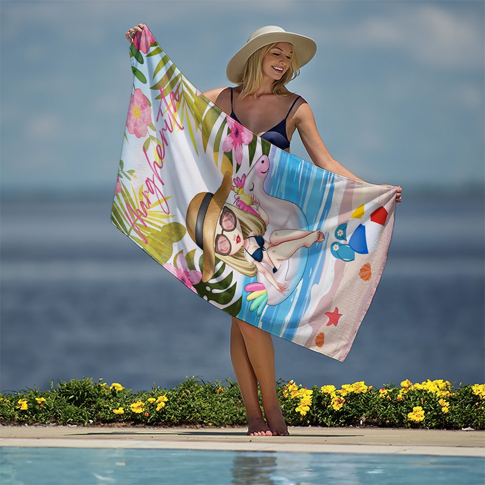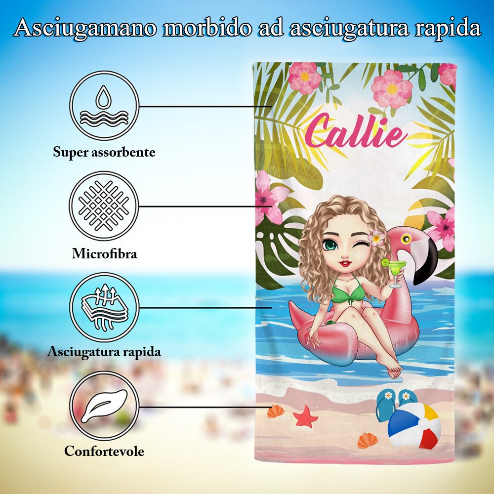 Questo telo mare si ispira alle piante tropicali e alle scene di spiaggia, richiamando tutta l’energia dell’estate. Il design, ricco di atmosfera artistica, supporta la personalizzazione con personaggi in stile cartone animato di varie età, bevande preferite e anelli da nuoto, per esprimere al meglio la tua personalità. Puoi aggiungere il tuo nome esclusivo, scegliendo tra 2 caratteri e 4 colori, per rendere ogni telo un regalo davvero speciale.