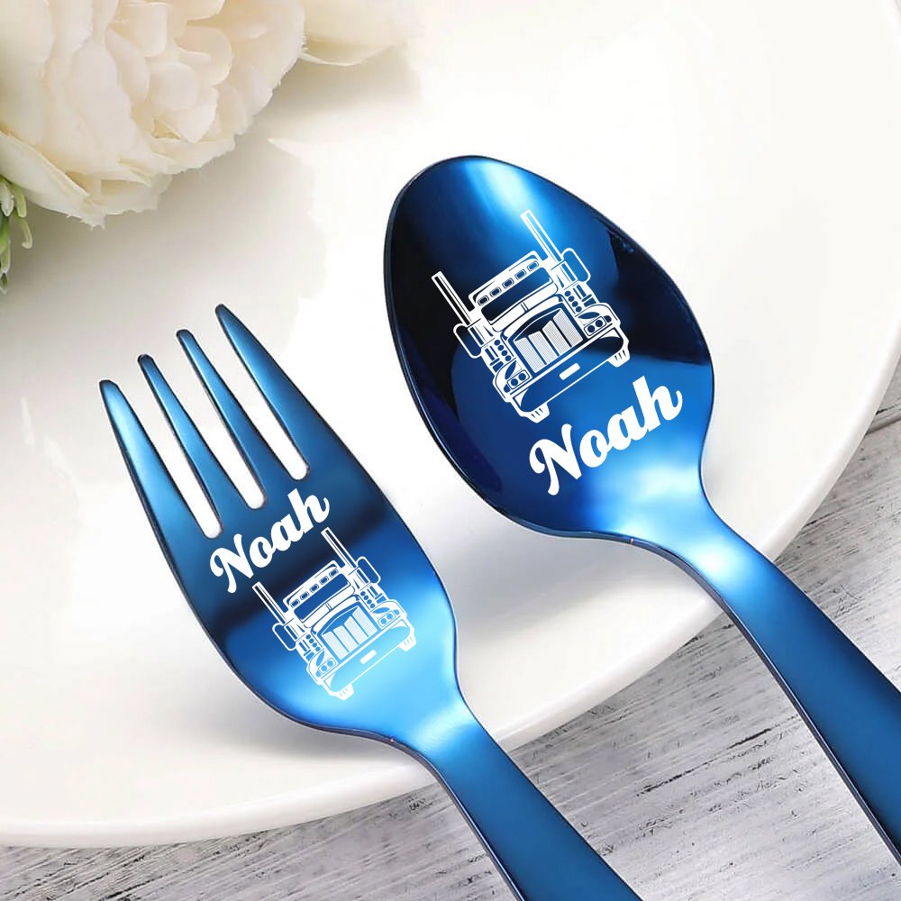 Le stoviglie possono essere personalizzate con qualsiasi nome o parola con un limite di 10 caratteri. Inoltre, è possibile scegliere il modello di camion preferito e il colore delle posate.