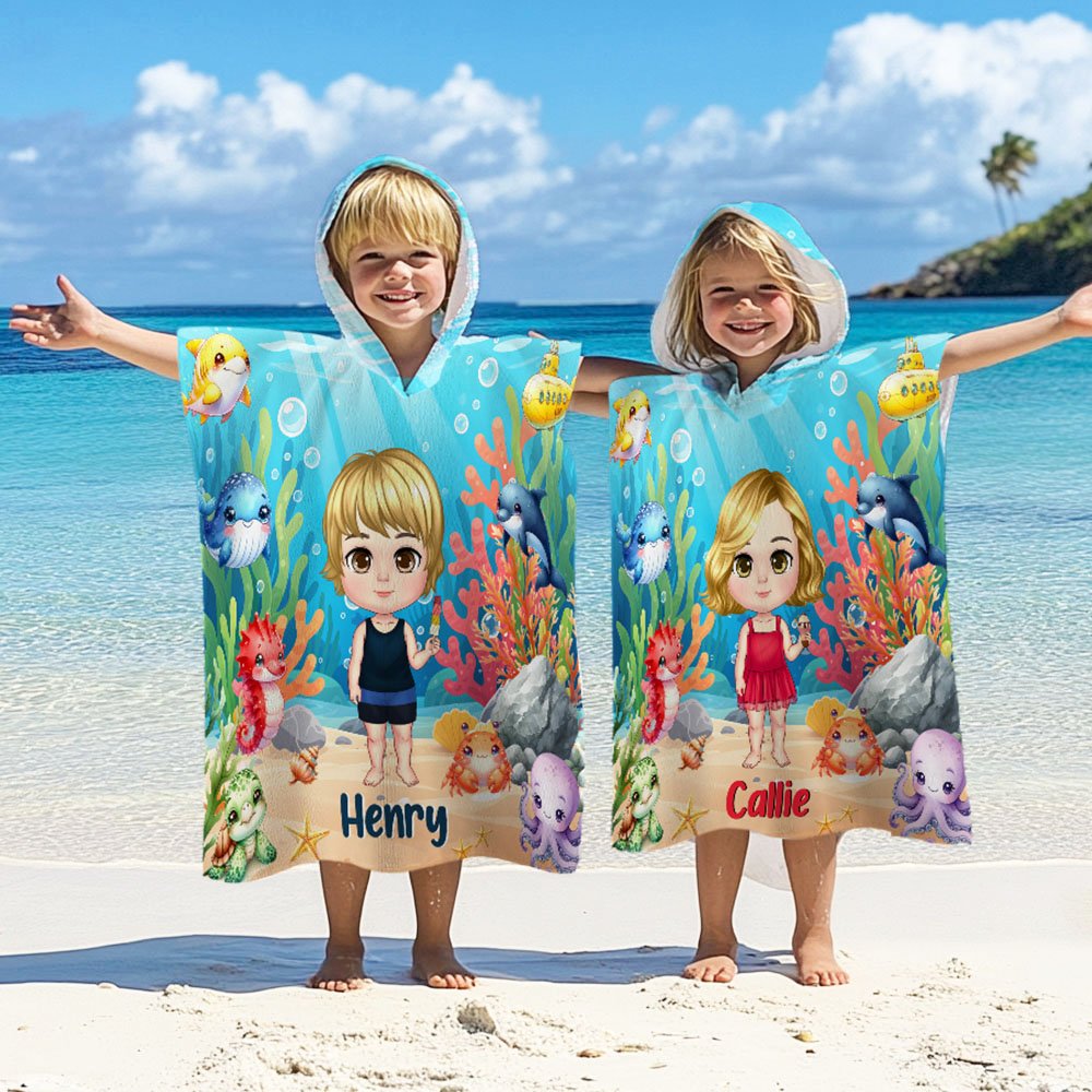 Caratterizzato da vivaci illustrazioni di tartarughe marine, delfini, squali, granchi e altre creature sottomarine, questo telo da mare con cappuccio dà vita al mondo sottomarino. Il design colorato e giocoso è perfetto per stimolare l'immaginazione e la gioia dei bambini, rendendolo uno dei preferiti sia per le giornate in spiaggia che per il bagno.