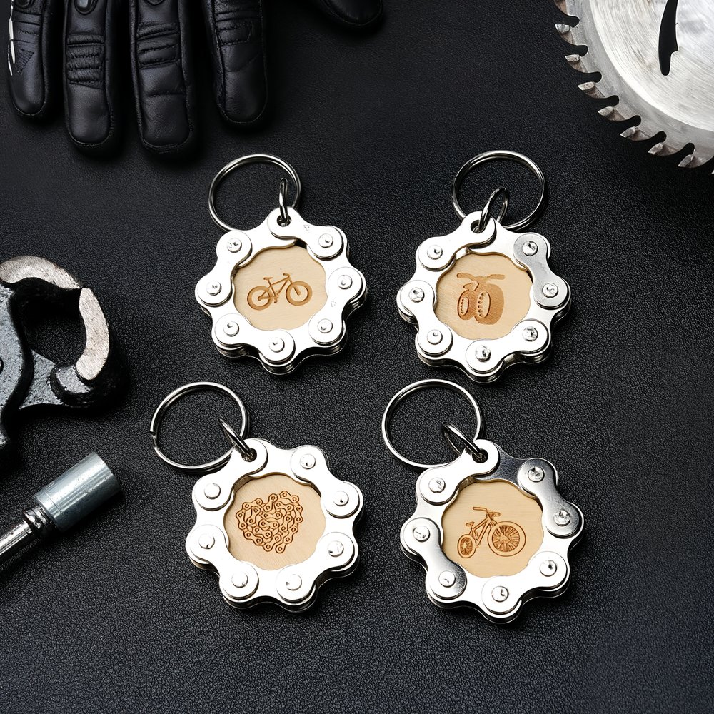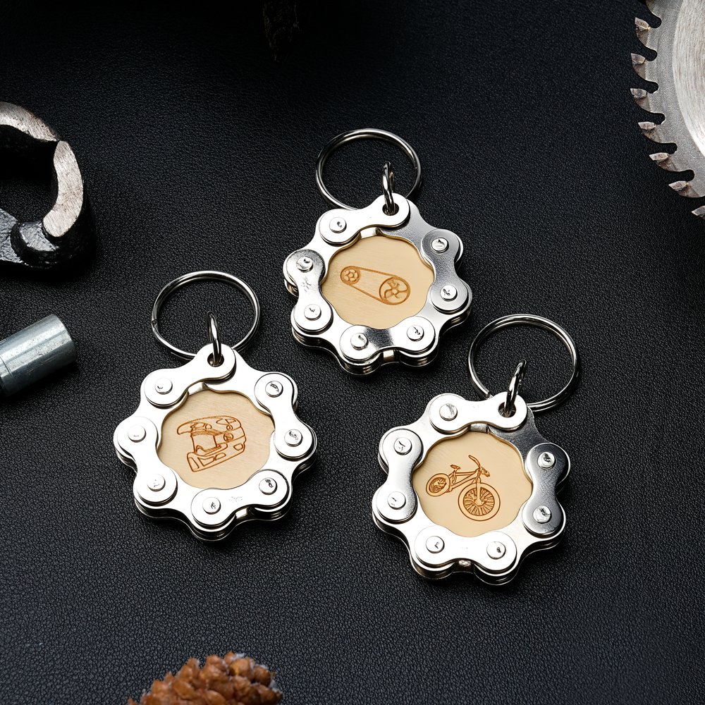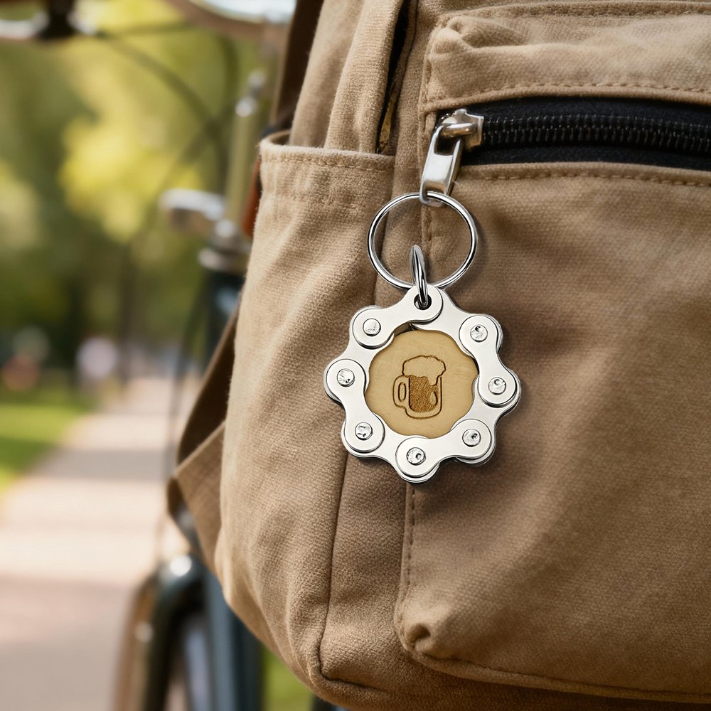 Realizzato con catene di biciclette riciclate e legno inciso al laser, questo portachiavi unisce la resistenza industriale al calore naturale. Combinando funzionalità e sostenibilità, il portachiavi utilizza parti di bicicletta e legno recuperati per creare un accessorio robusto per tutti i giorni.