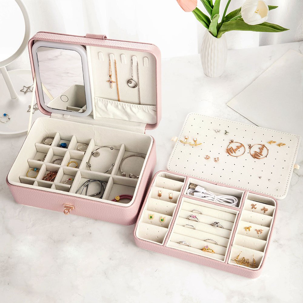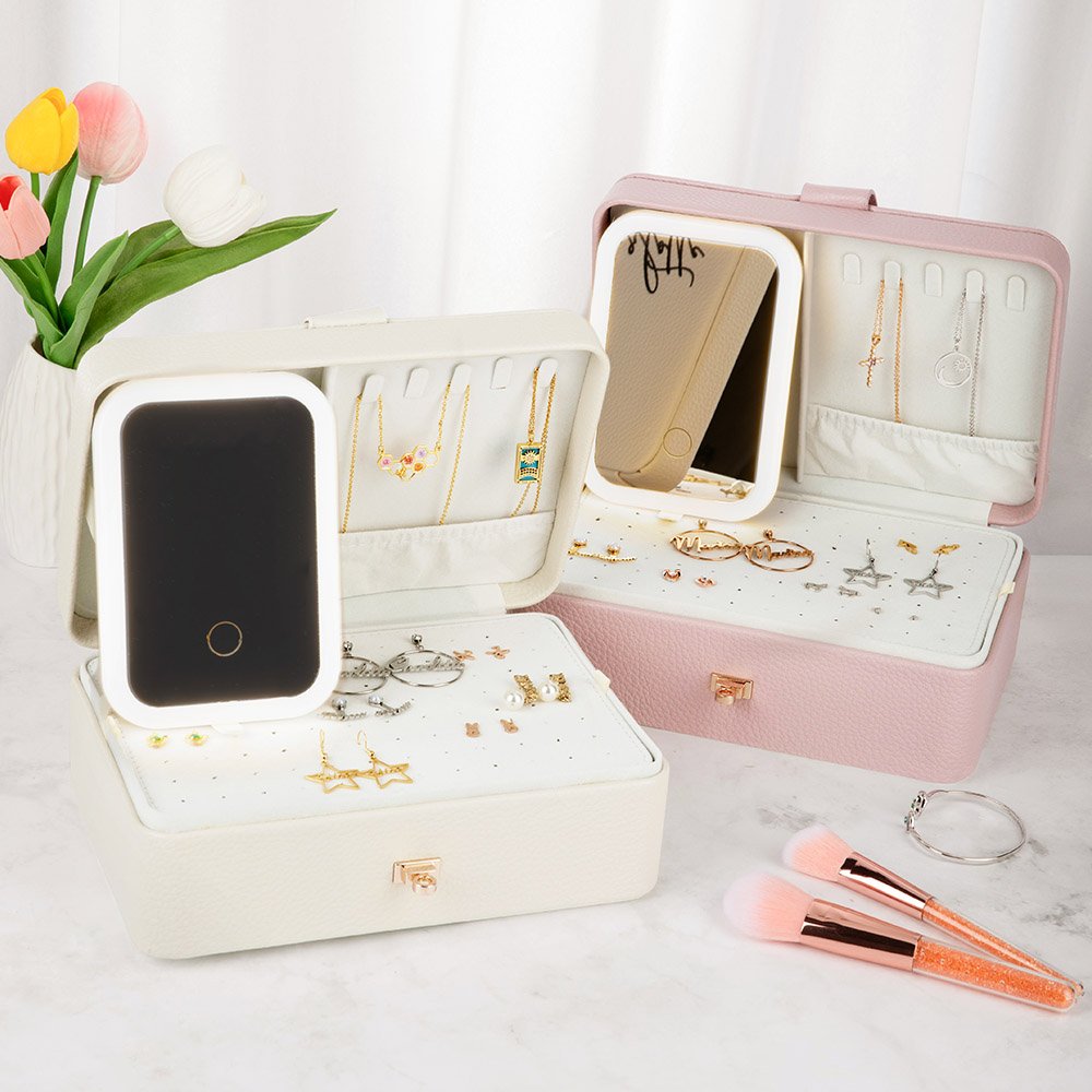 Questo portagioie è realizzato in materiale PU di alta qualità per garantirne la durata e la praticità. Il portagioie ha un totale di tre strati, ognuno dei quali è dotato di diversi scomparti. La sua disposizione raffinata rende la conservazione dei gioielli più organizzata ed evita efficacemente il rischio di impigliarsi e di danneggiarsi. Inoltre, questo portagioie è dotato di una striscia luminosa a LED regolabile a tre colori, che non solo offre una comoda funzione di illuminazione, ma crea anche un ambiente caldo e romantico in cui riporre gli oggetti.