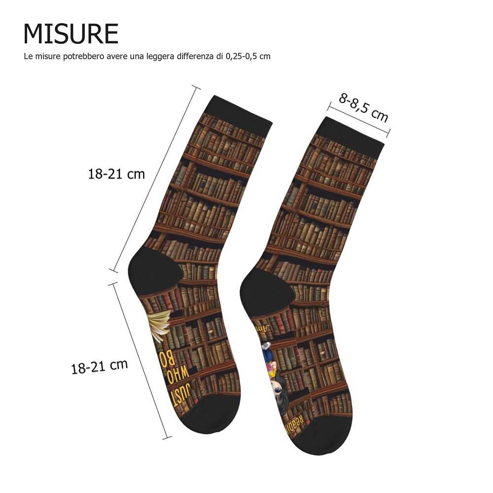 Ispirati al tema della lettura, questi calzini mostrano un originale design a scaffale in stile retrò, creando l'effetto di una piccola libreria ai tuoi piedi. Gli scaffali ordinati, insieme al personaggio in stile cartone animato intento a leggere, trasmettono perfettamente la tranquillità e il fascino della lettura. Puoi personalizzarli con il tuo nome, trasformandoli in un accessorio unico che racconta la tua personalità e la tua passione per i libri.