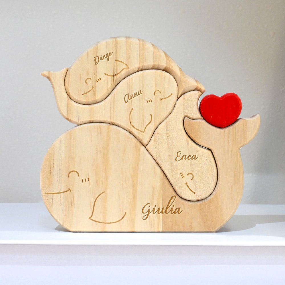 Questo puzzle in legno presenta balene simpatiche in stile cartone animato: una mamma e cuccioli abbracciati teneramente. Un cuore rosso al centro simboleggia l'amore forte e indivisibile della famiglia. Ogni balena rappresenta un membro del nucleo familiare: puoi scegliere il numero di balene in base alle tue esigenze, personalizzandoli con i nomi per creare un puzzle esclusivo come la tua famiglia.