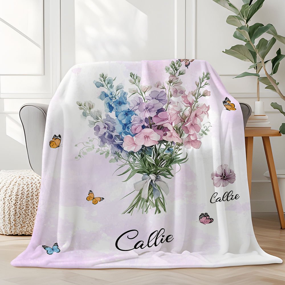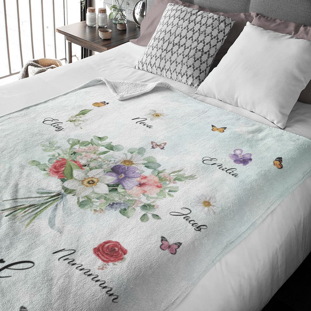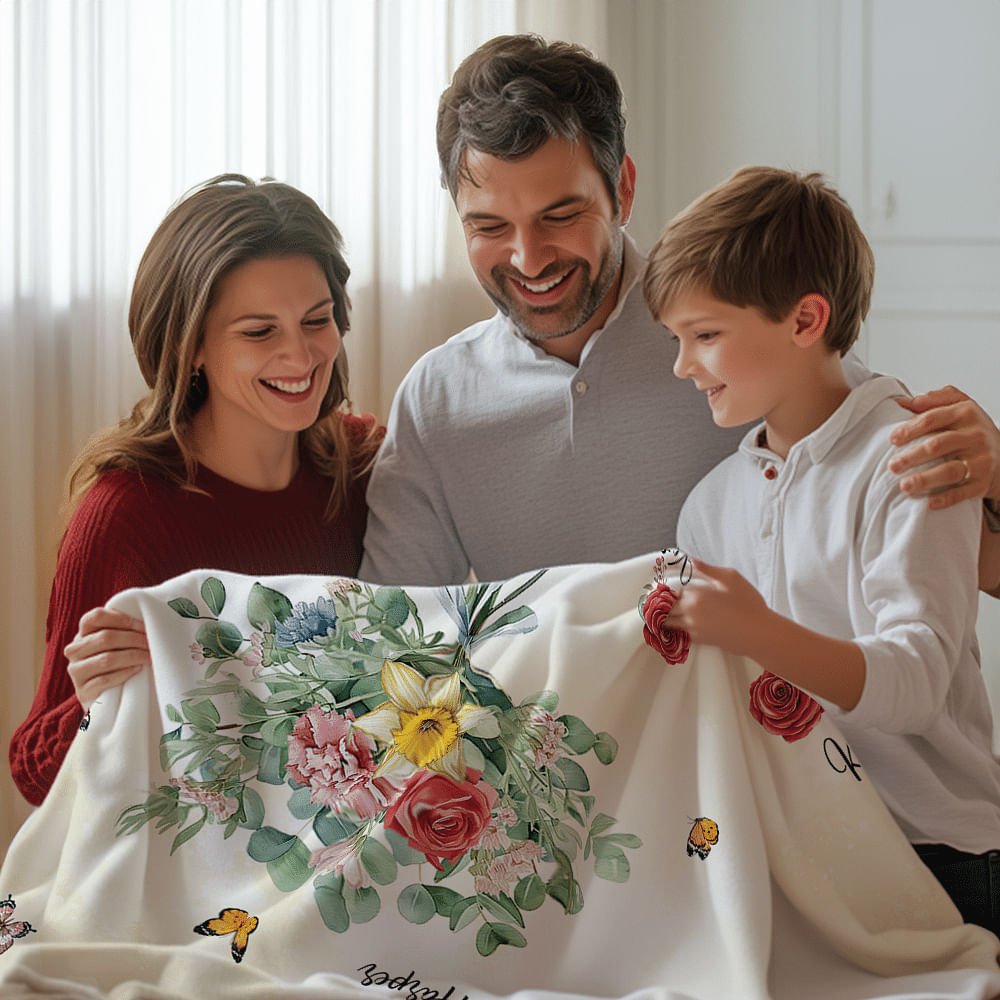 Questa morbida coperta è un pezzo di conforto e sentimento splendidamente personalizzabile. Presenta un titolo personalizzato e un intricato disegno di bouquet di compleanno che può essere personalizzato con i fiori di compleanno di 1-8 membri della famiglia, rappresentando visivamente l'amore familiare. Ogni fiore di compleanno simboleggia un caro membro della famiglia, trasformando la coperta in un albero genealogico in fiore. Questo design premuroso permette al destinatario di sentirsi amato dalla sua famiglia.