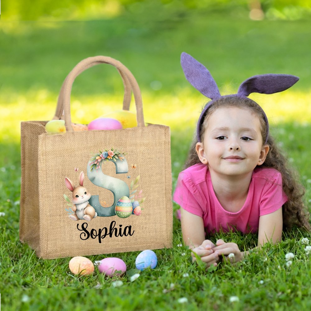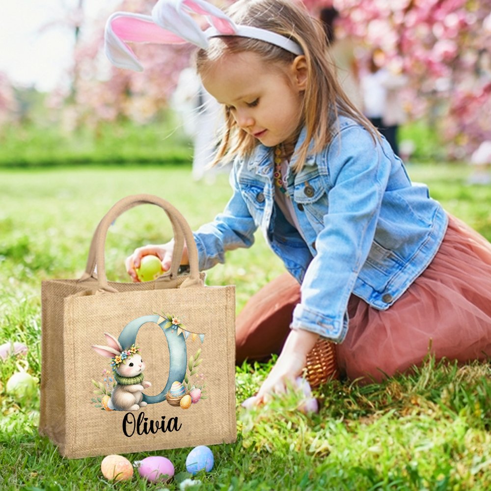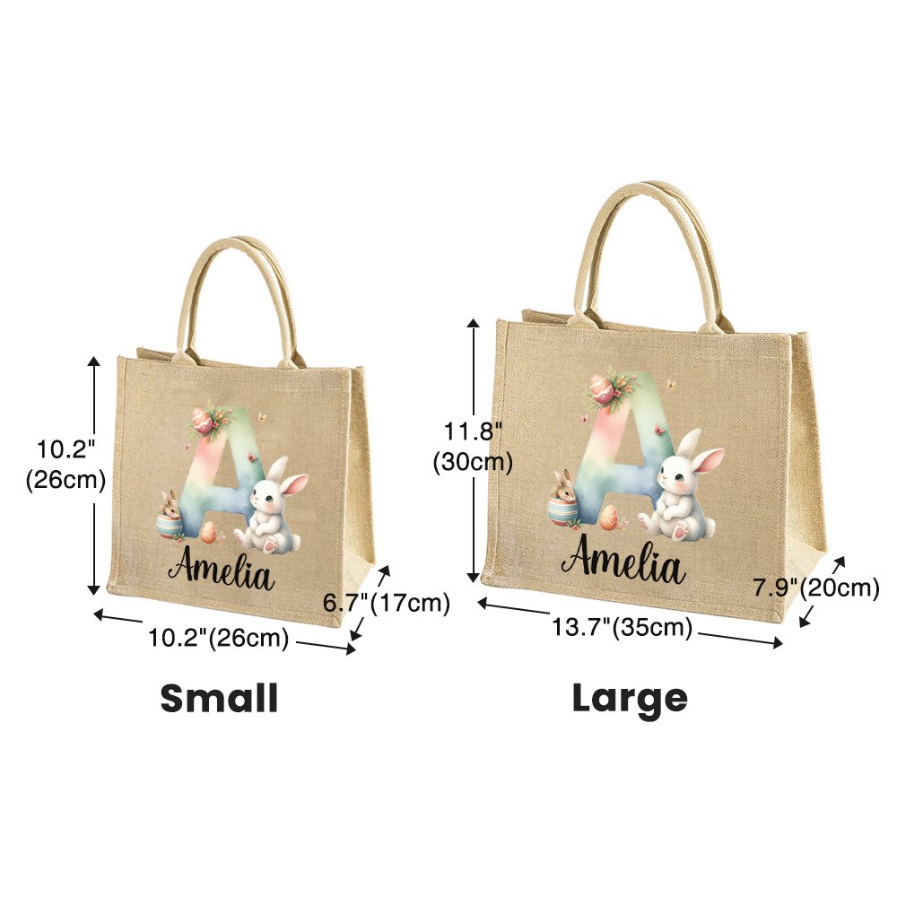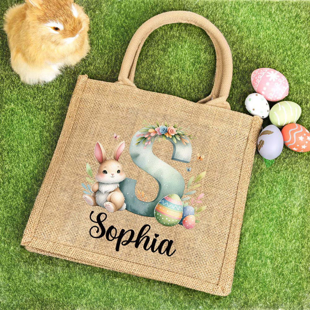 Questo delizioso sacchetto di iuta presenta un simpatico coniglietto e uova acquerellate, con iniziali personalizzabili impreziosite da fiori ed erba luminosi. Se a ciò si aggiunge il disegno del nome personalizzabile, è l'accessorio personalizzato perfetto per celebrare la Pasqua.