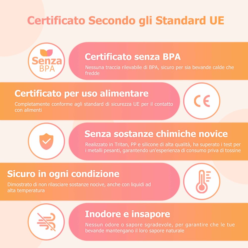 | Cura: | - Non mettere la borraccia in lavastoviglie o nel microonde. La pulizia può essere effettuata facilmente con un detersivo delicato e acqua calda. - Non superare i 45 °C di temperatura. La borraccia non è isolata termicamente e potrebbe scottare se riempita con acqua calda. - Il coperchio della borraccia garantisce una buona tenuta, facendo aumentare gradualmente la pressione interna. All'apertura, potrebbe fuoriuscire acqua. Si consiglia di non puntarla verso persone e di rilasciare la pressione prima di bere. - Conservare la borraccia pulita e asciutta in un luogo fresco e asciutto, lontano dalla luce diretta del sole, per prevenire la formazione di muffa o funghi. - Si consiglia di sostituire la borraccia ogni 6-12 mesi. |