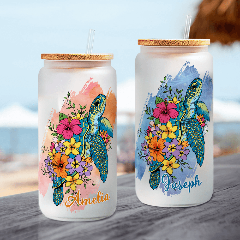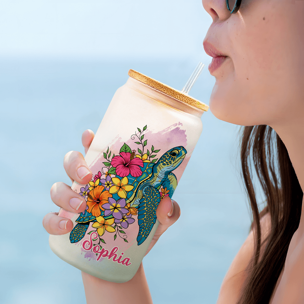 Con il romanticismo dell'oceano come ispirazione principale, questo design presenta una tartaruga marina circondata da fiori su uno sfondo di pennellate acquerellate, come se si tenesse tra le mani il rilassante ambiente marino. Il nome personalizzabile rende questo bicchiere un compagno davvero unico.