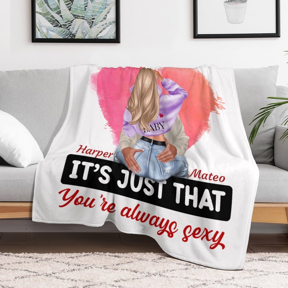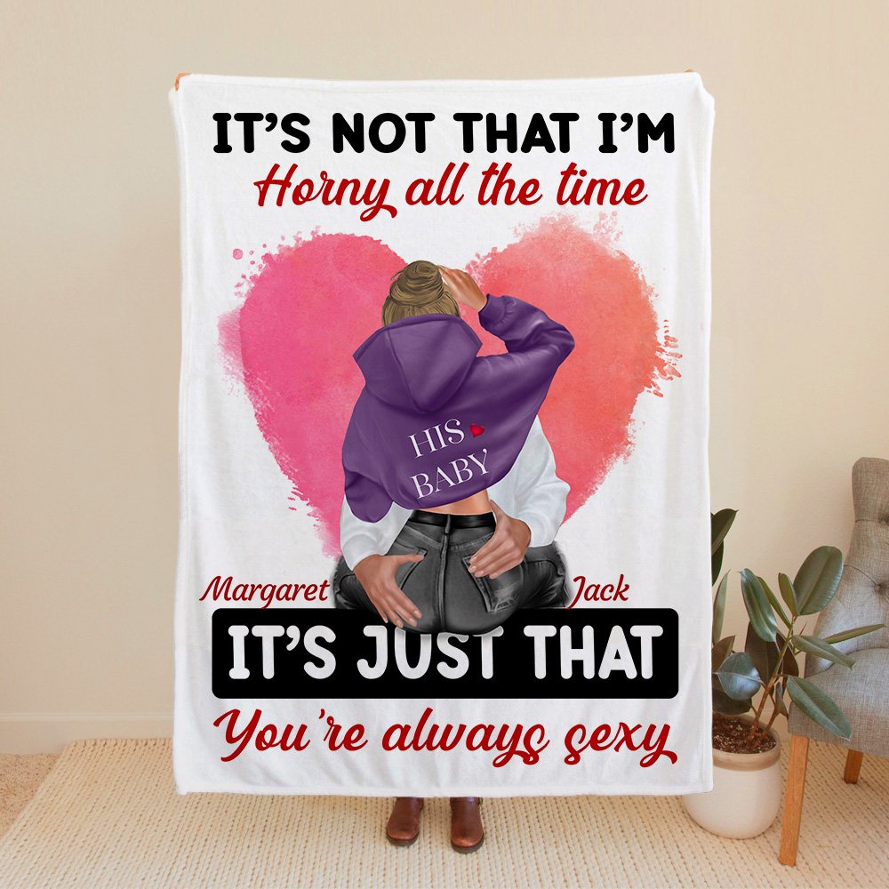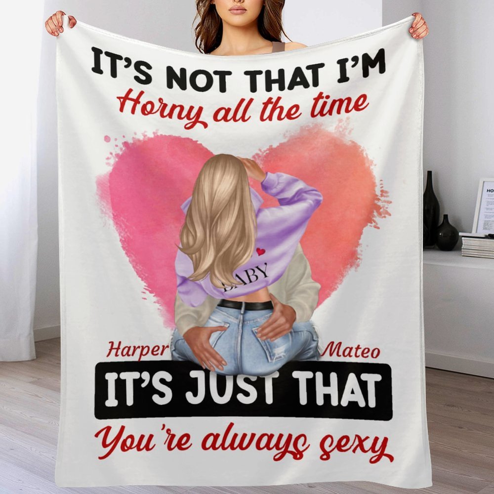 La nostra coperta presenta una coppia abbracciata come elemento di design, con un cuore d'amore acquerellato come sfondo e il testo "Non è che sono sempre arrapato, è solo che tu sei sempre sexy" per rendere il design complessivo più emotivo. La coperta in sé simboleggia il calore, mentre il disegno dell'amante le conferisce un significato più passionale e romantico, rendendo questa coperta una vera necessità per le coppie.