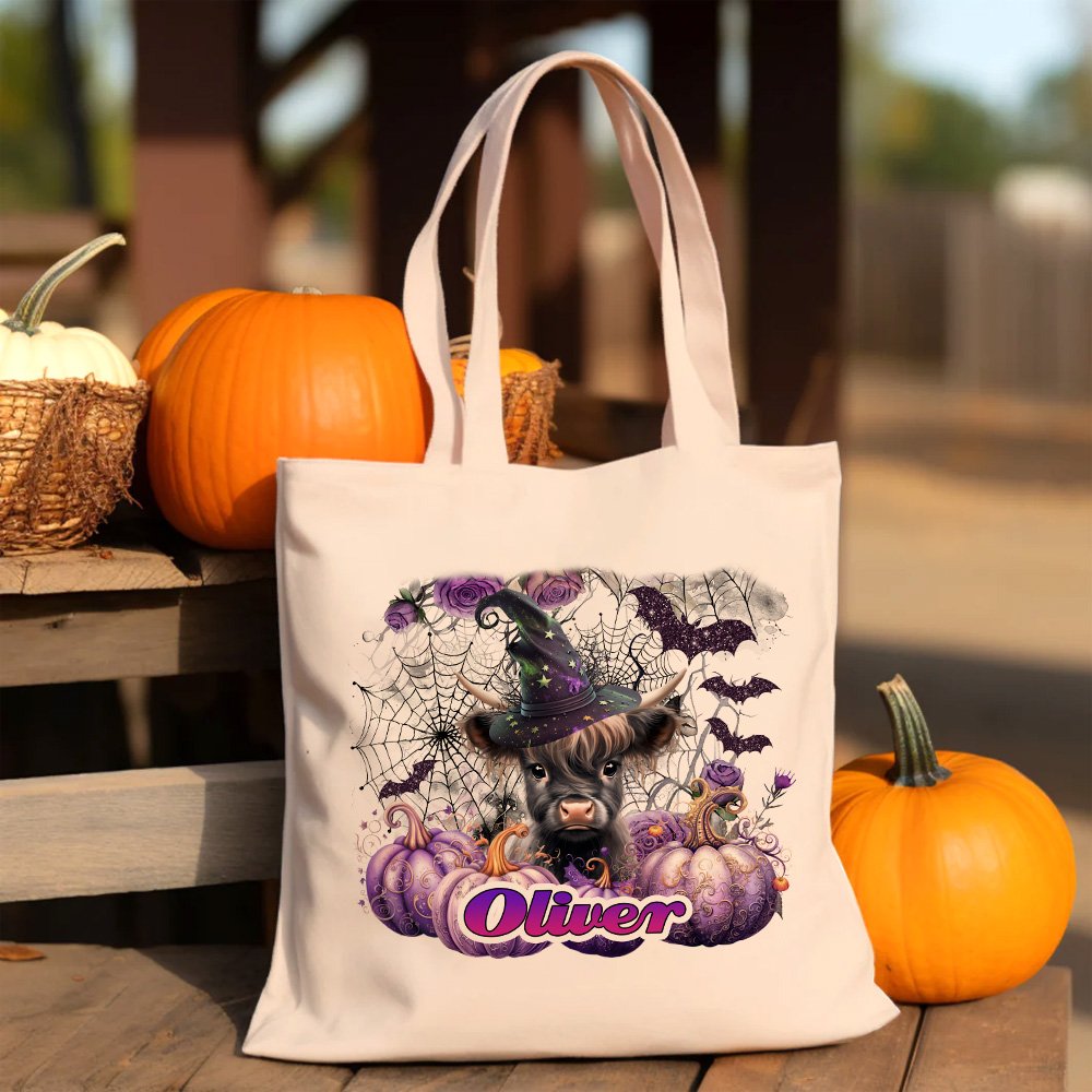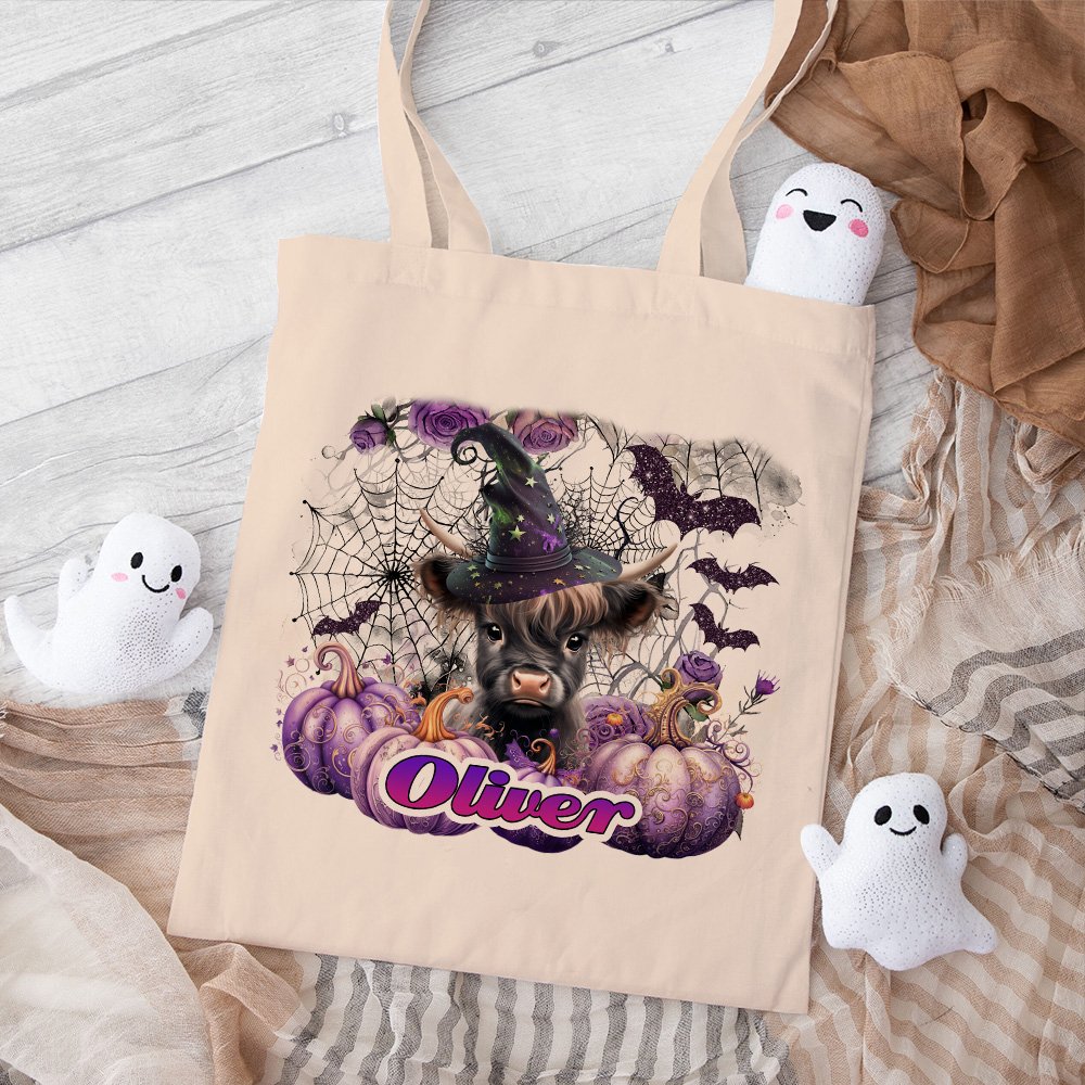 Personalizzato Viola Rosa Zucca Magica Strega Highland Mucca Tela Tote Bag con nome Halloween Regalo di Natale per ragazzi Ragazze