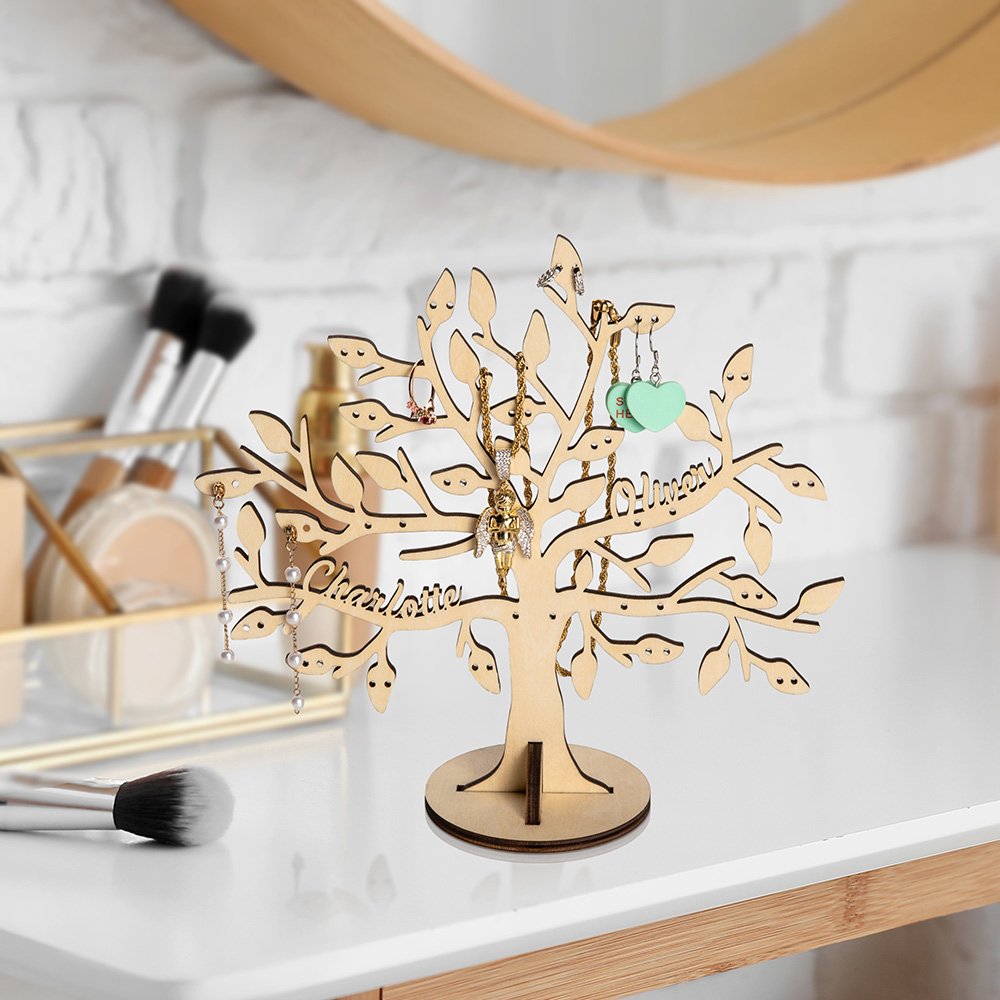 Il portagioie presenta l'affascinante silhouette di un albero, simbolo di forza, crescita e interconnessione della famiglia. I rami possono essere personalizzati con il nome della persona amata. Questo pezzo personalizzabile può contenere fino a 6 nomi, consentendo di esporre l'intero albero genealogico in modo unico e personalizzato.