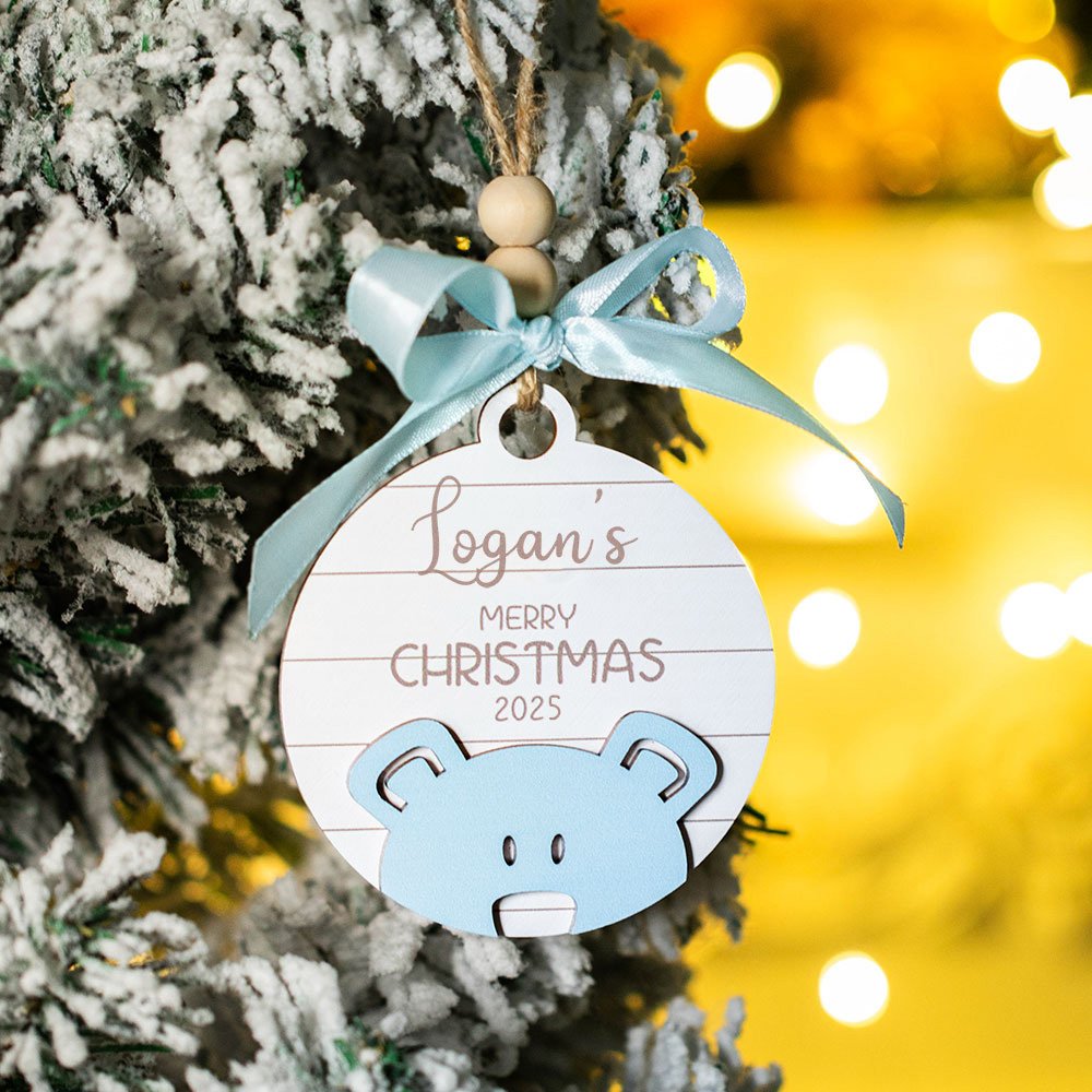 Questo affascinante ornamento presenta un simpatico orsetto montato saldamente su una base di legno, con il nome del bambino e l'anno di nascita splendidamente incisi, che lo rendono speciale.