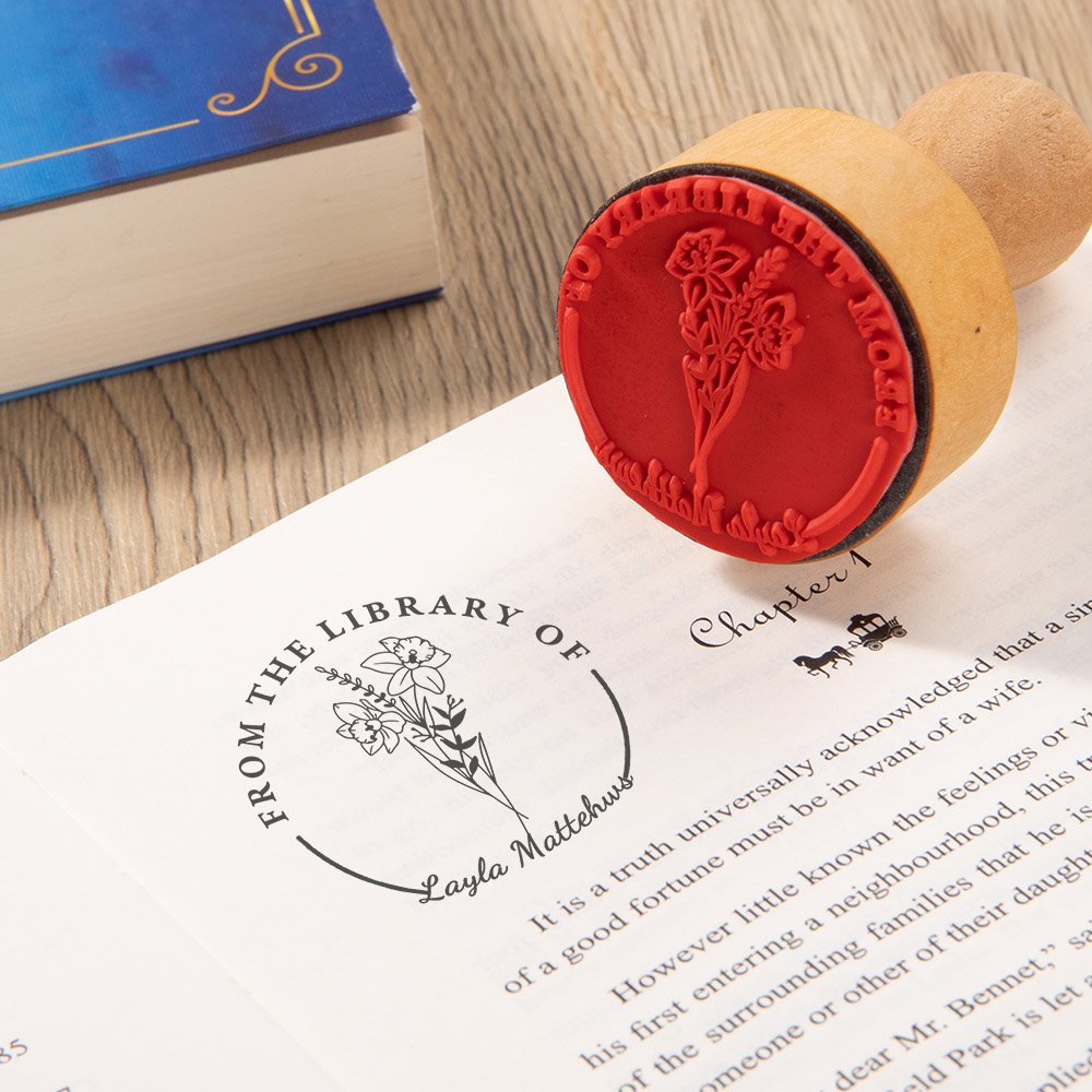 Questo timbro presenta un design affascinante con un fiore di compleanno e un testo fisso" dalla biblioteca di ". Sono disponibili due stili tra cui scegliere, che combinano eleganza e praticità, rendendoli uno strumento unico per gli amanti dei libri e i bibliotecari.