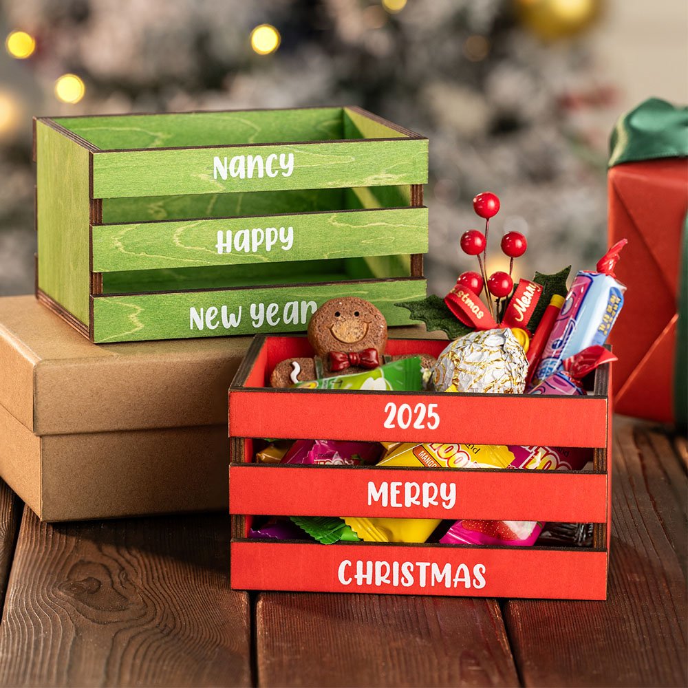 Questa cassa di legno può contenere caramelle, snack o decorazioni festive. Può servire come delizioso centrotavola sulla tavola di Natale o come contenitore decorativo sotto l'albero, migliorando l'arredamento generale delle feste e fornendo allo stesso tempo un contenitore funzionale.