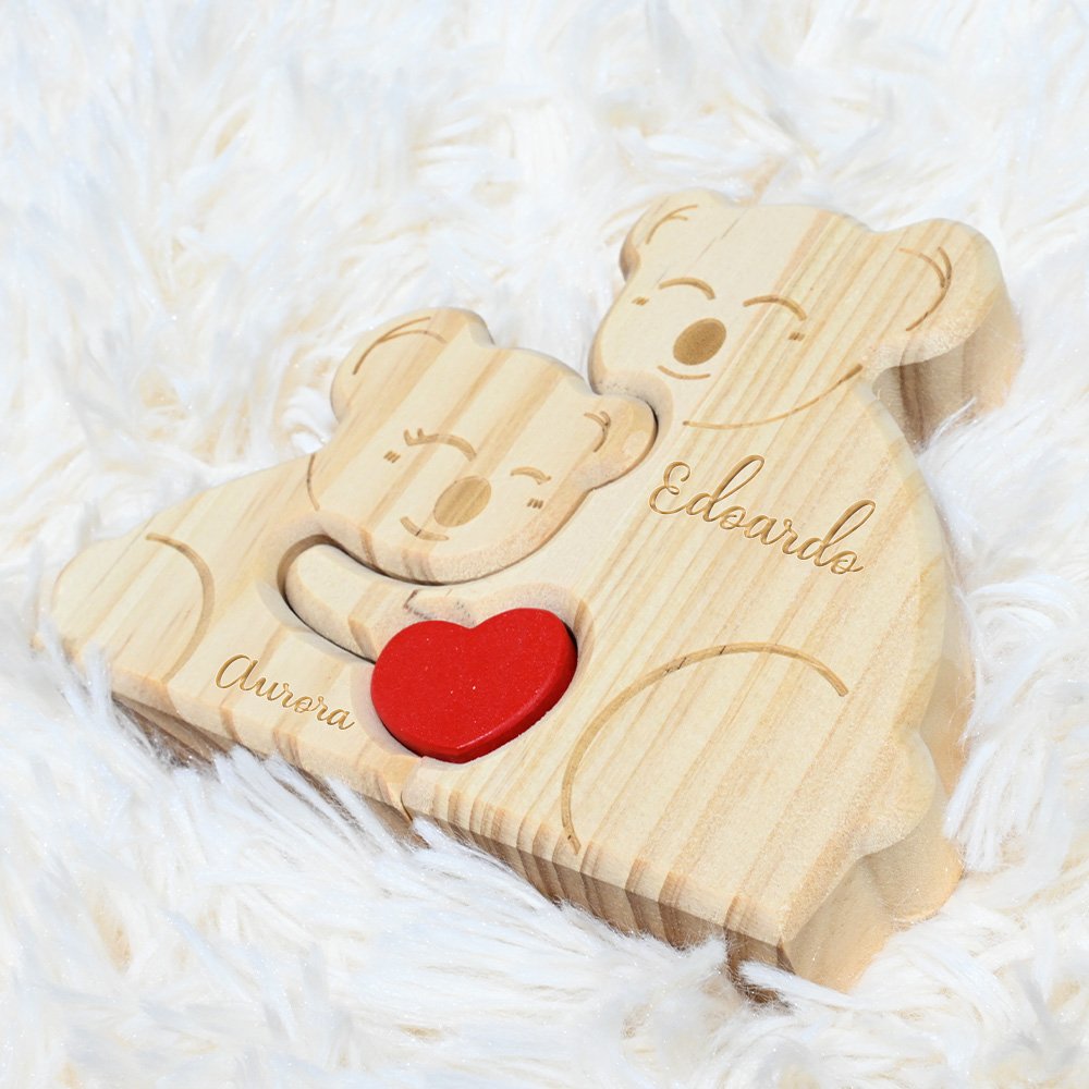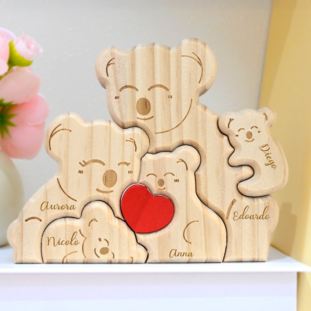Questo puzzle in legno presenta koala simpatici in stile cartone animato: una mamma, un papà e cuccioli abbracciati teneramente. Un cuore rosso al centro simboleggia l'amore forte e indivisibile della famiglia. Ogni koala rappresenta un membro del nucleo familiare: puoi scegliere il numero di koala in base alle tue esigenze, personalizzandoli con i nomi per creare un puzzle esclusivo come la tua famiglia.