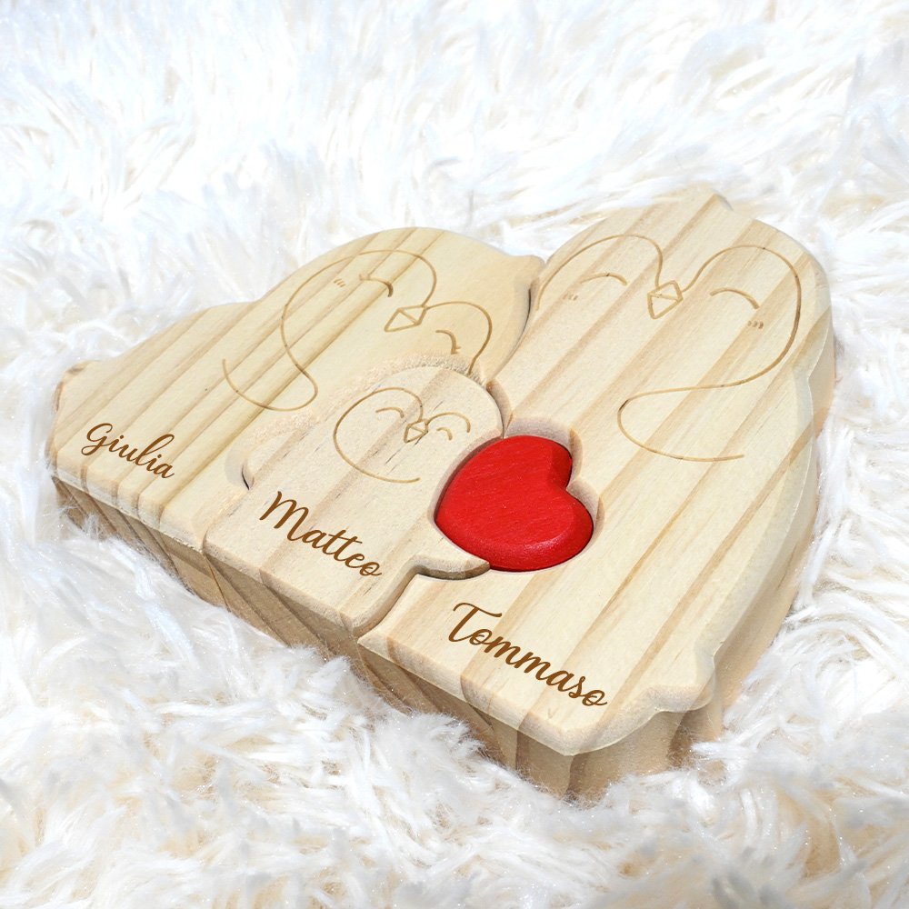Ispirato all'immagine affettuosa e simpatica dei pinguini, questo puzzle rappresenta perfettamente il legame profondo tra i membri della famiglia. Ogni pezzo può essere personalizzato con un nome e può contenere da 2 a 5 membri della famiglia. Il cuore rosso al centro si incastra armoniosamente con il resto del puzzle, simboleggiando l'affetto e l'amore inseparabili che uniscono la famiglia.