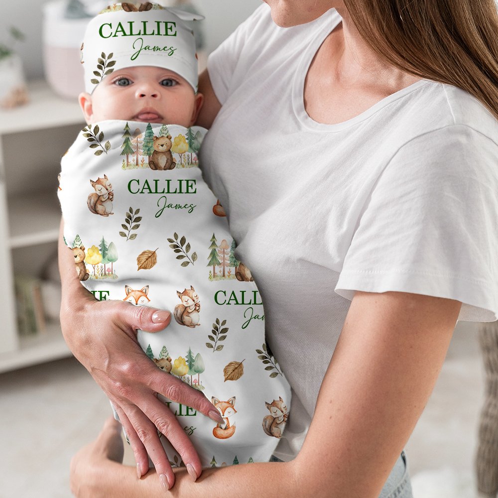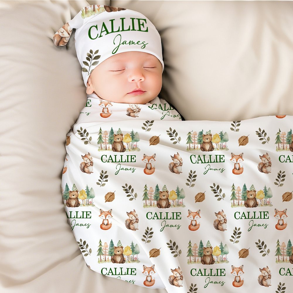 Questo set di fasce è caratterizzato da un adorabile tema di animali del bosco, incorpora il nome del bambino nel design ed è disponibile in una varietà di animali. Questo esclusivo set regalo da 2 pezzi, che comprende un cappellino e una coperta, sarà un regalo importante per la festa del bebè.