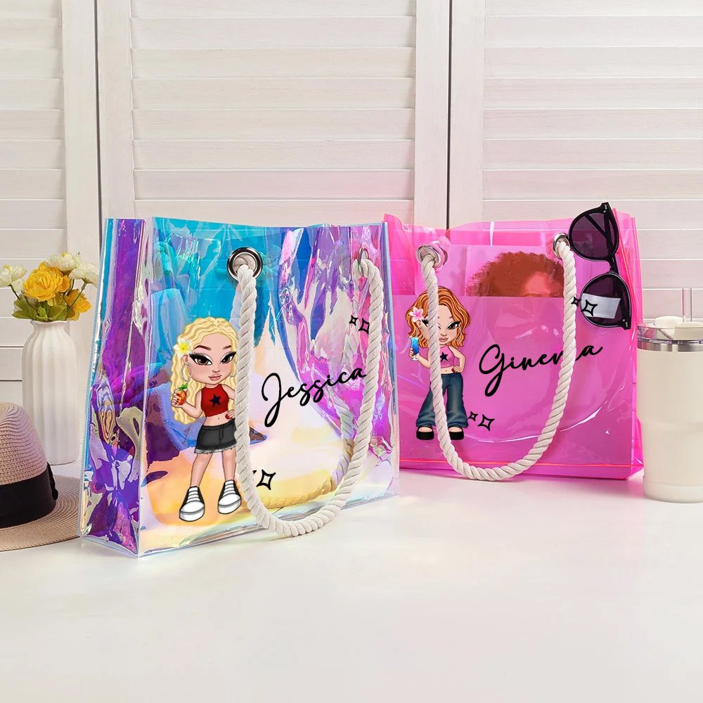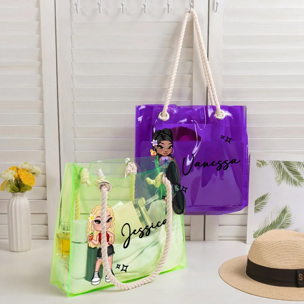 Abbraccia la tendenza Y2K con questa borsa tote personalizzata con il tuo personaggio in stile cartone animato preferito e il tuo nome. La trasparenza e i colori vivaci mettono in risalto la tua personalità.