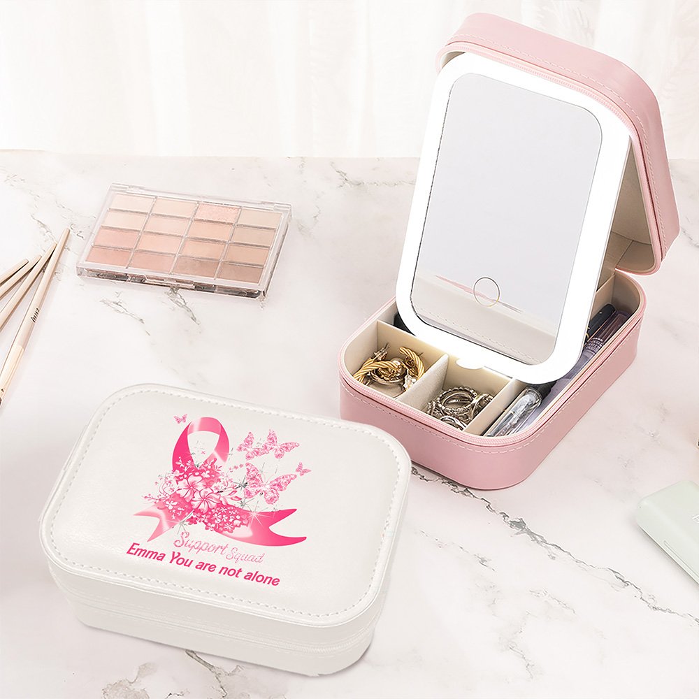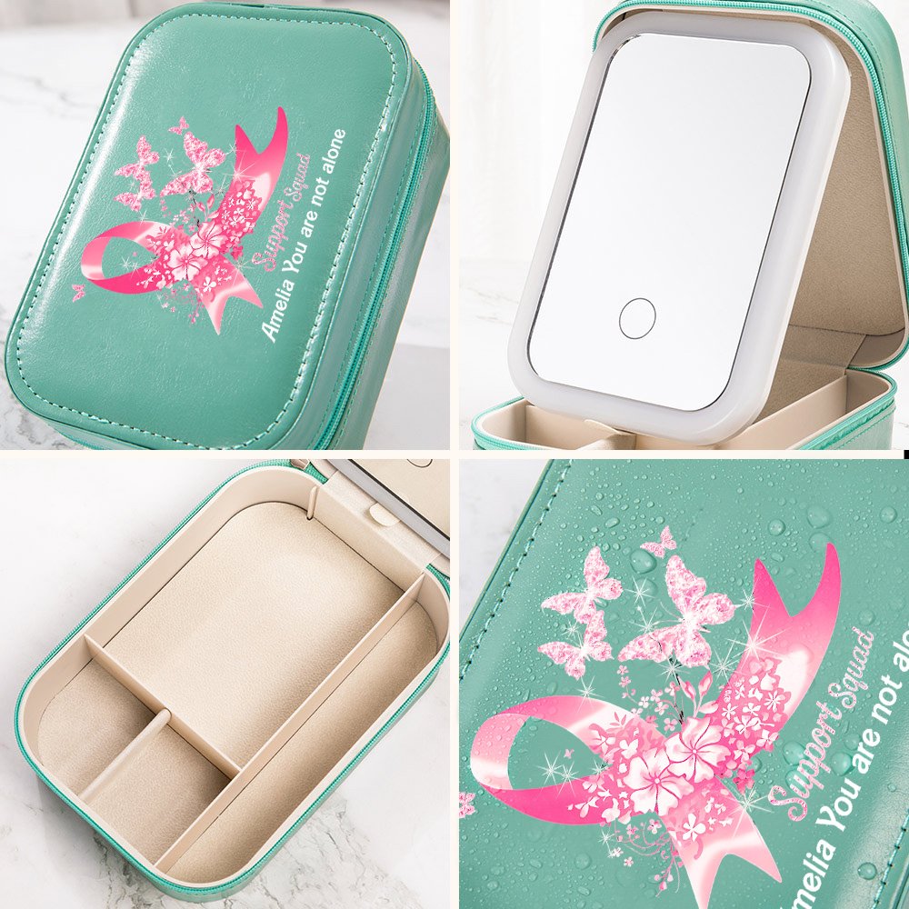 Questo portagioie è caratterizzato da un nastro rosa e da un motivo a farfalla, che non solo aggiunge bellezza al portagioie, ma simboleggia anche la speranza e la resilienza delle sopravvissute al cancro al seno. La scritta "Support Squad, You are not alone" sul nastro rende il portagioie pieno di amore e sostegno. Il nome può anche essere personalizzato sul portagioie per trasmettere sostegno e incoraggiamento alla paziente, rendendolo un regalo pieno di amore e cura.
